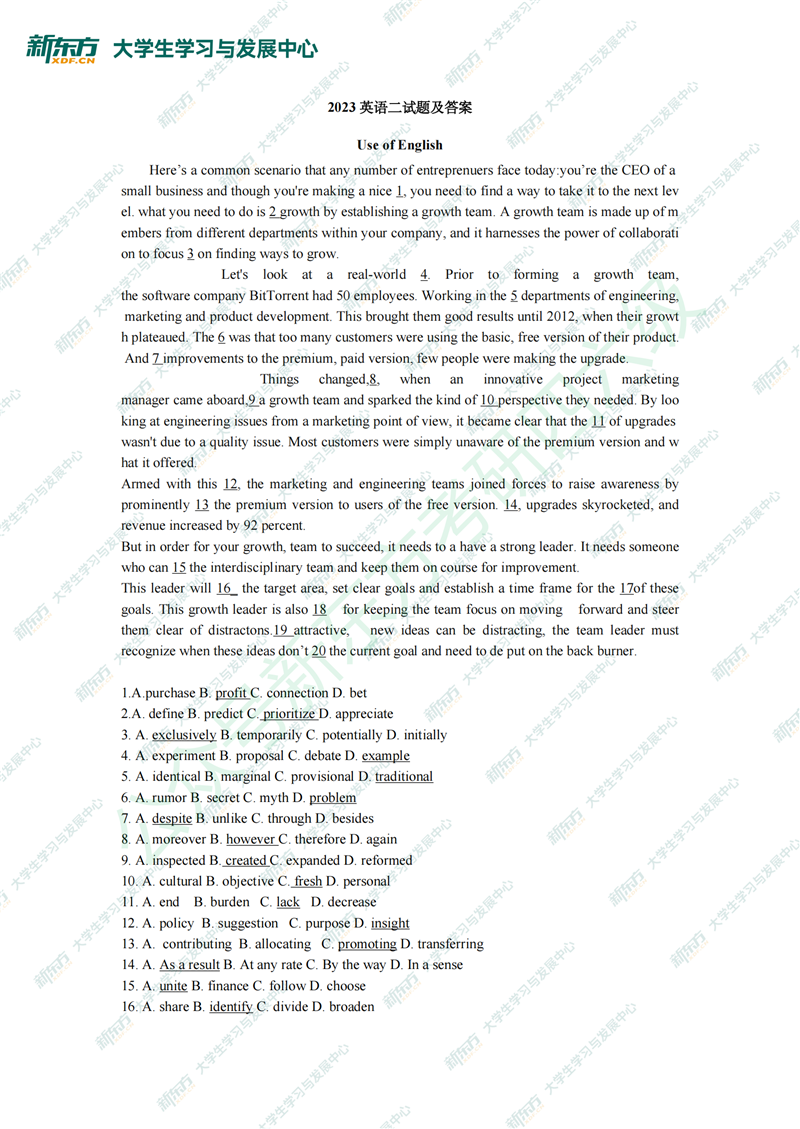 考研真题可以帮助考生在备考过程中了解考试内容和题型、把握考试难度和命题规律、检测学习效果和水平,从而提高应试的方法和经验。因此,新东方为同学们提供了2023英语二考研真题及答案解析,希望可以帮助到大家。