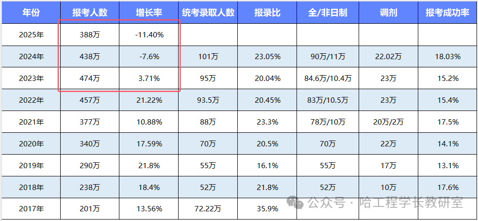 11月21日,教育部公布了2025年全国硕士研究生报名人数为388万,较2024年(438万)再降50万!
