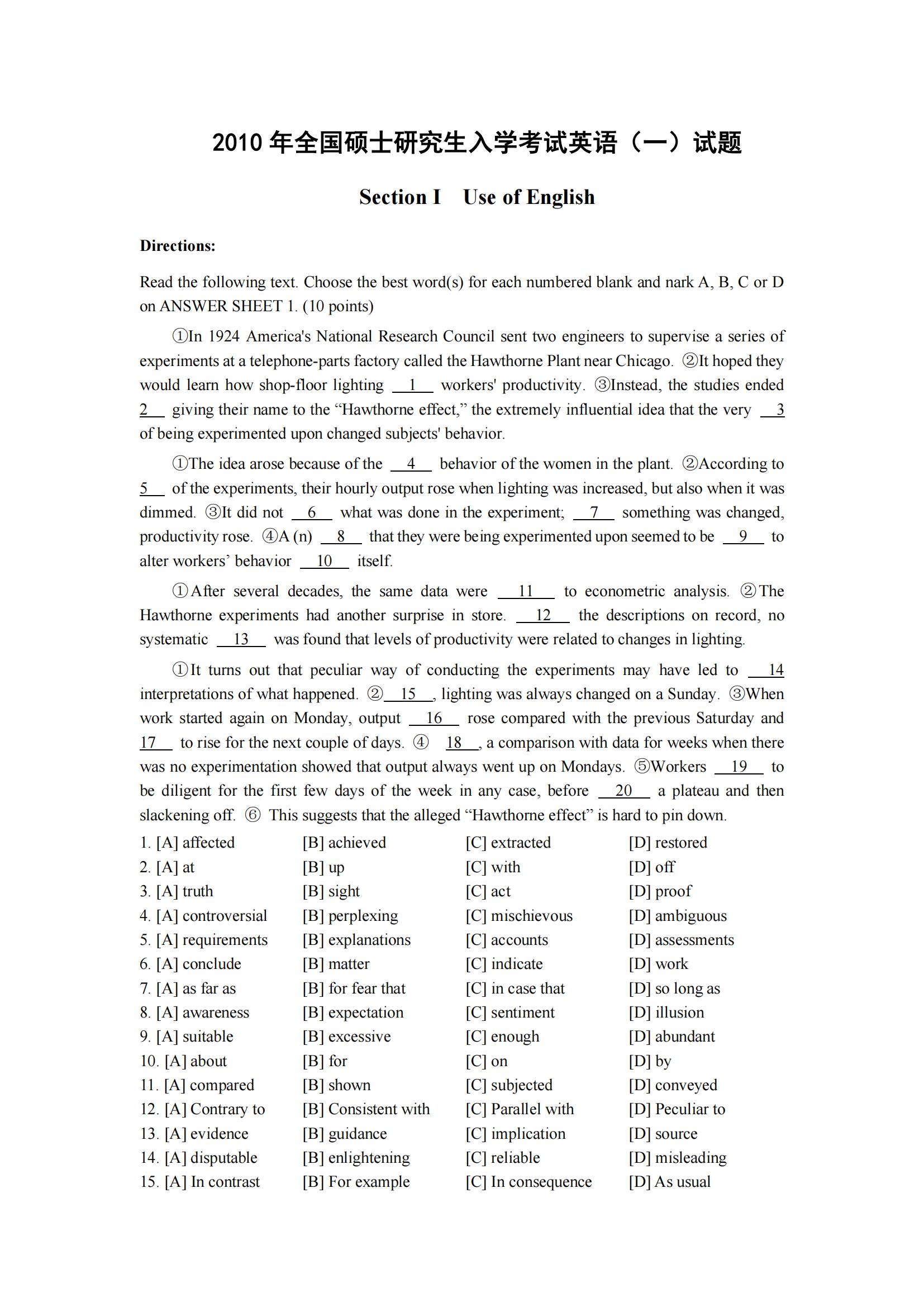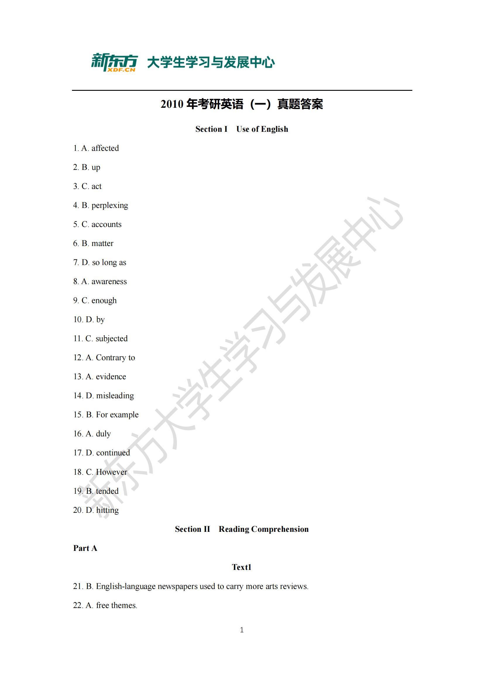 真题对于每位考研党来说是个非常重要的学习资料,多刷几遍真题能够帮助同学们查漏补缺、熟悉题型、培养做题习惯等。因此,浙江新东方在此为同学们提供了2010年考研英语(一)真题及答案,希望能够帮助大家更好的准备考研英语,通过不断的练习与总结,掌握重点,攻克难点。更多资料获取可点击新东方考研网联系在线老师进行咨询。