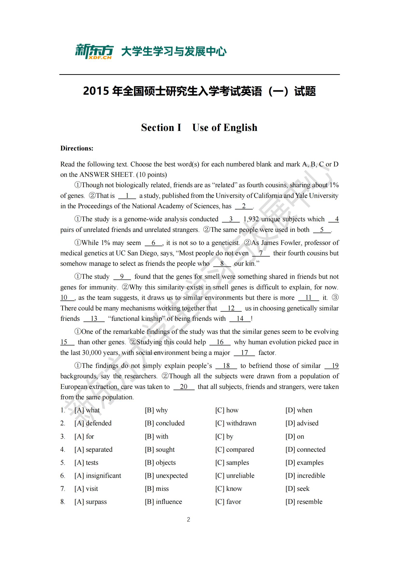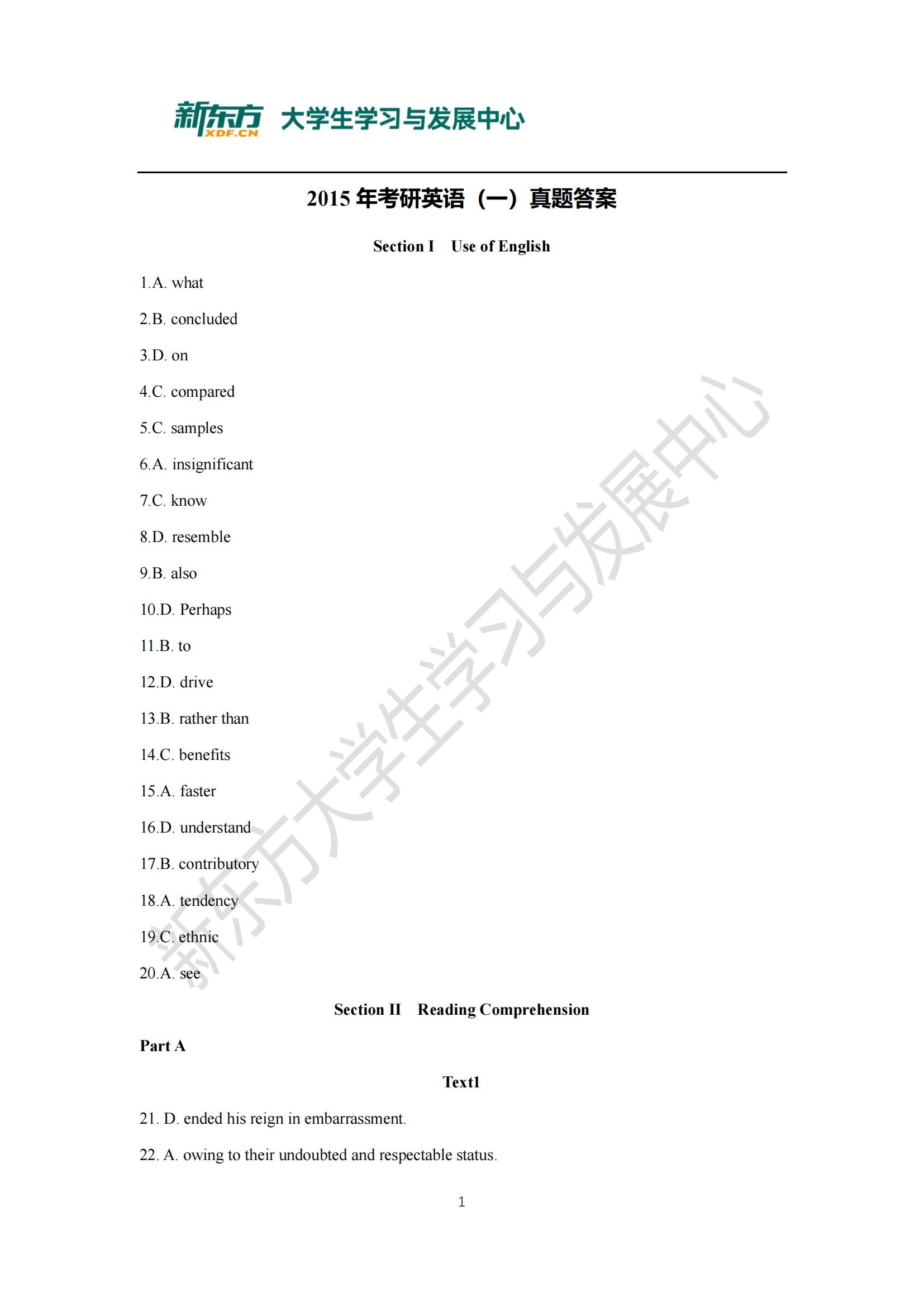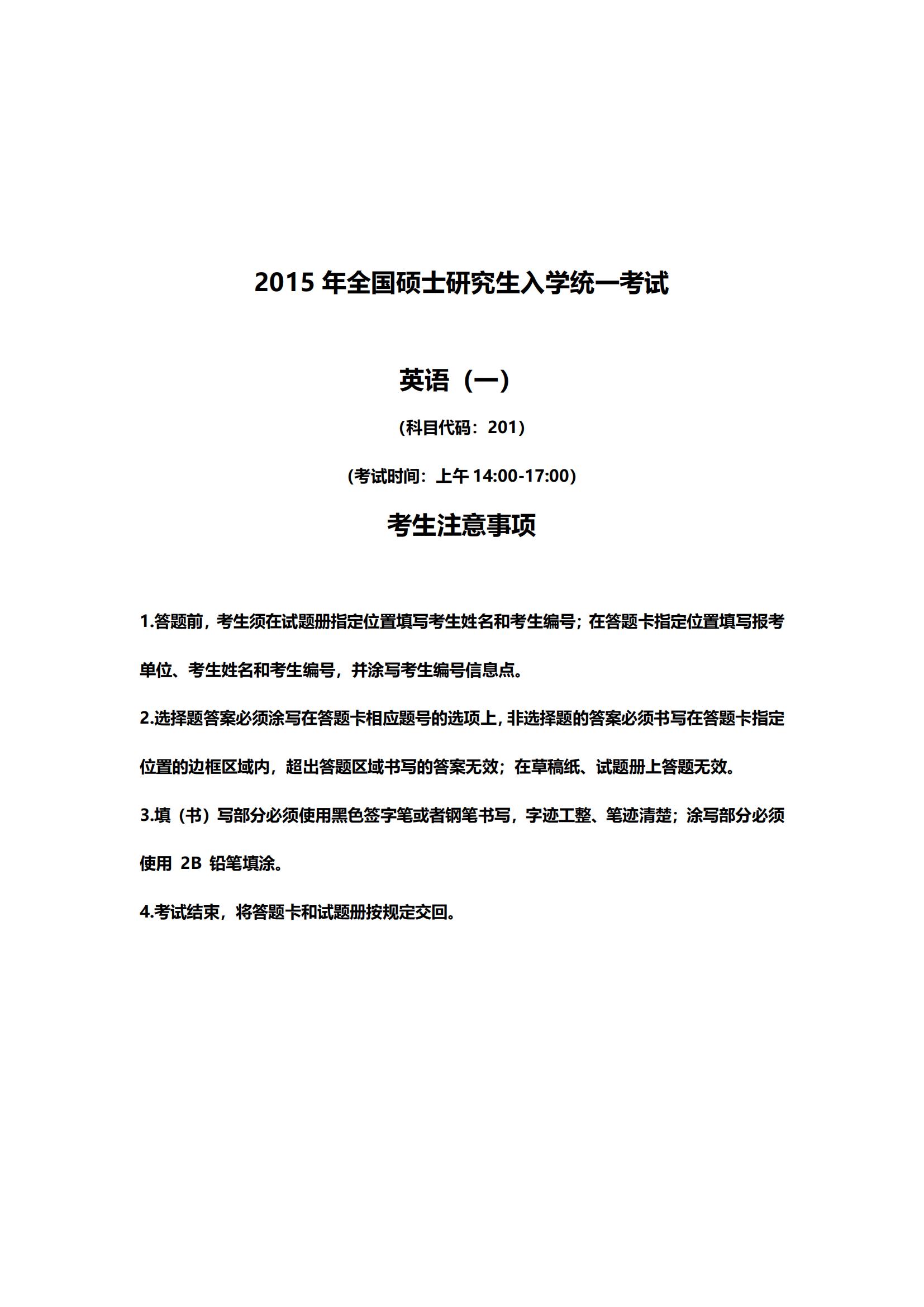 【历年考研真题】2015年考研英语(一)真题及答案
