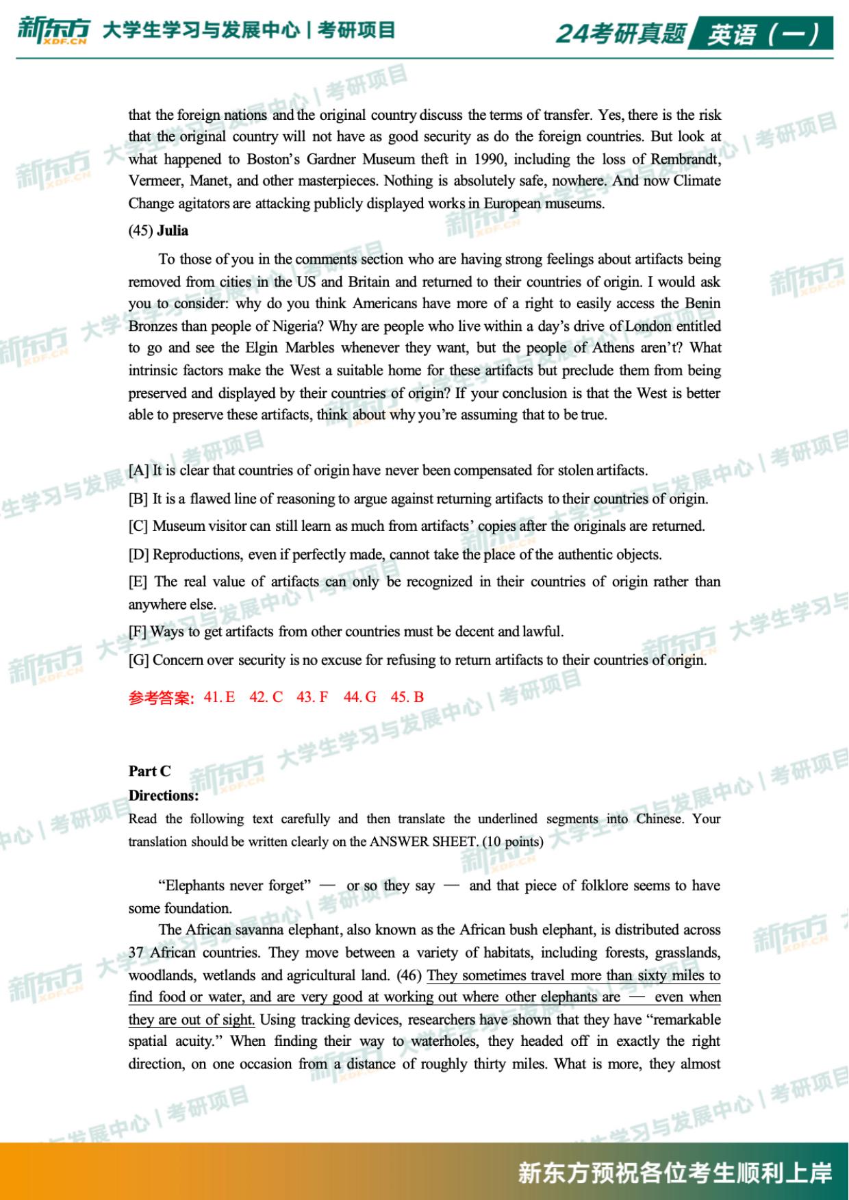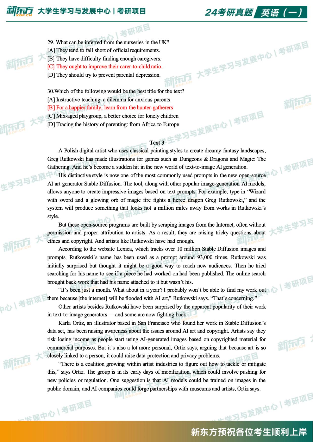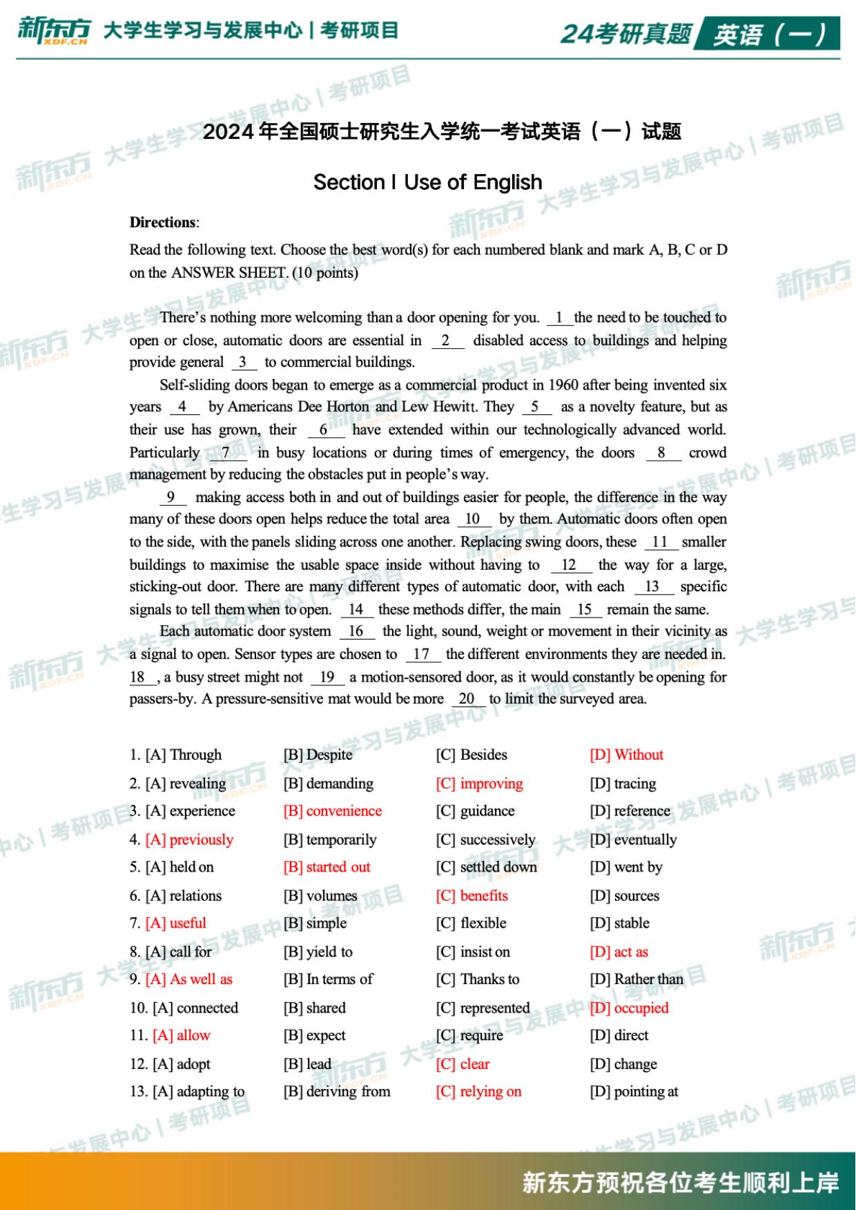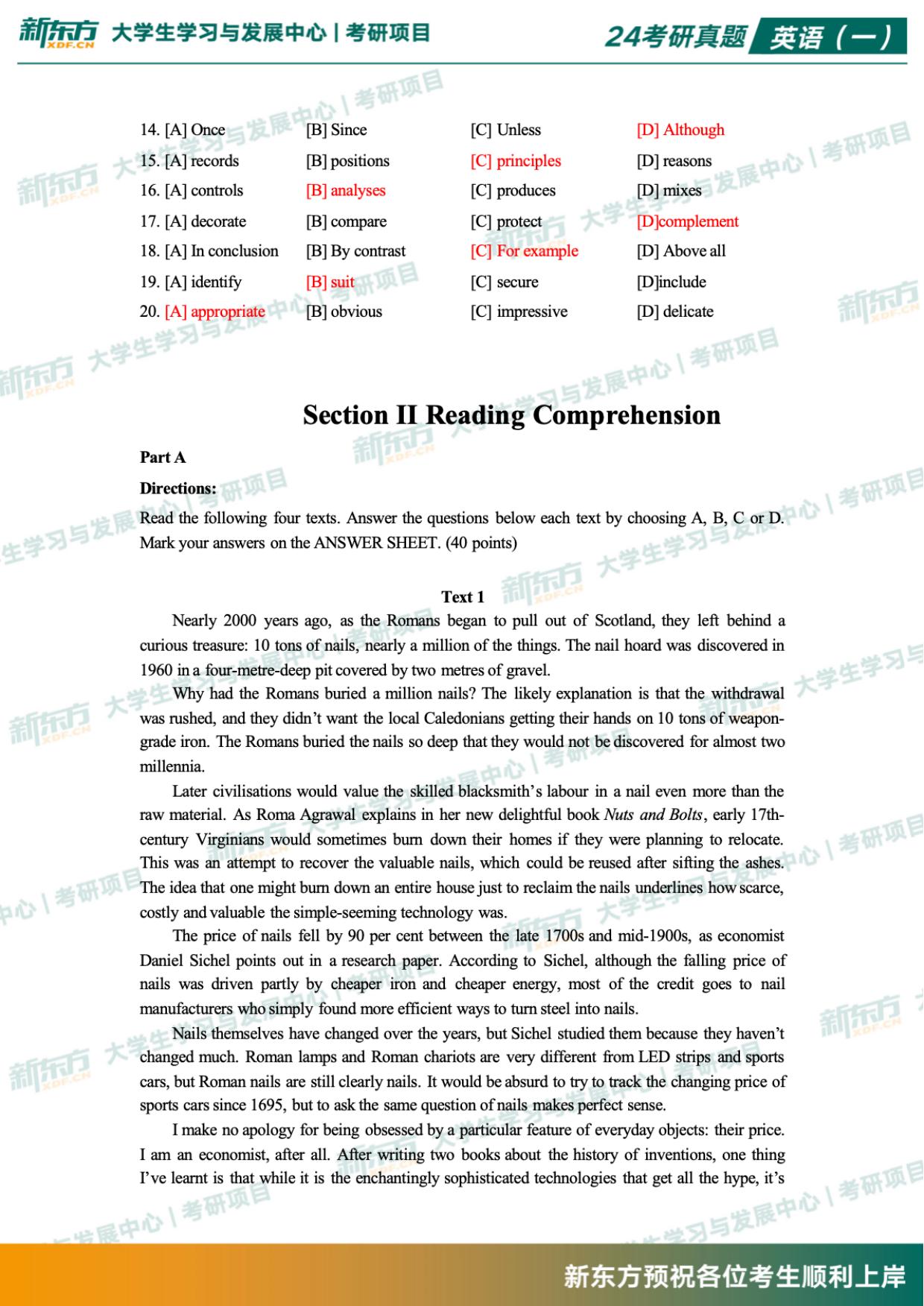 真题对于每位考研党来说是个非常重要的学习资料,多刷几遍真题能够帮助同学们查漏补缺、熟悉题型、培养做题习惯等。因此,浙江新东方在此为同学们提供了2024年考研英语(一)真题及答案,希望能够帮助大家更好的准备考研英语,通过不断的练习与总结,掌握重点,攻克难点。更多资料获取可点击新东方考研网联系在线老师进行咨询。