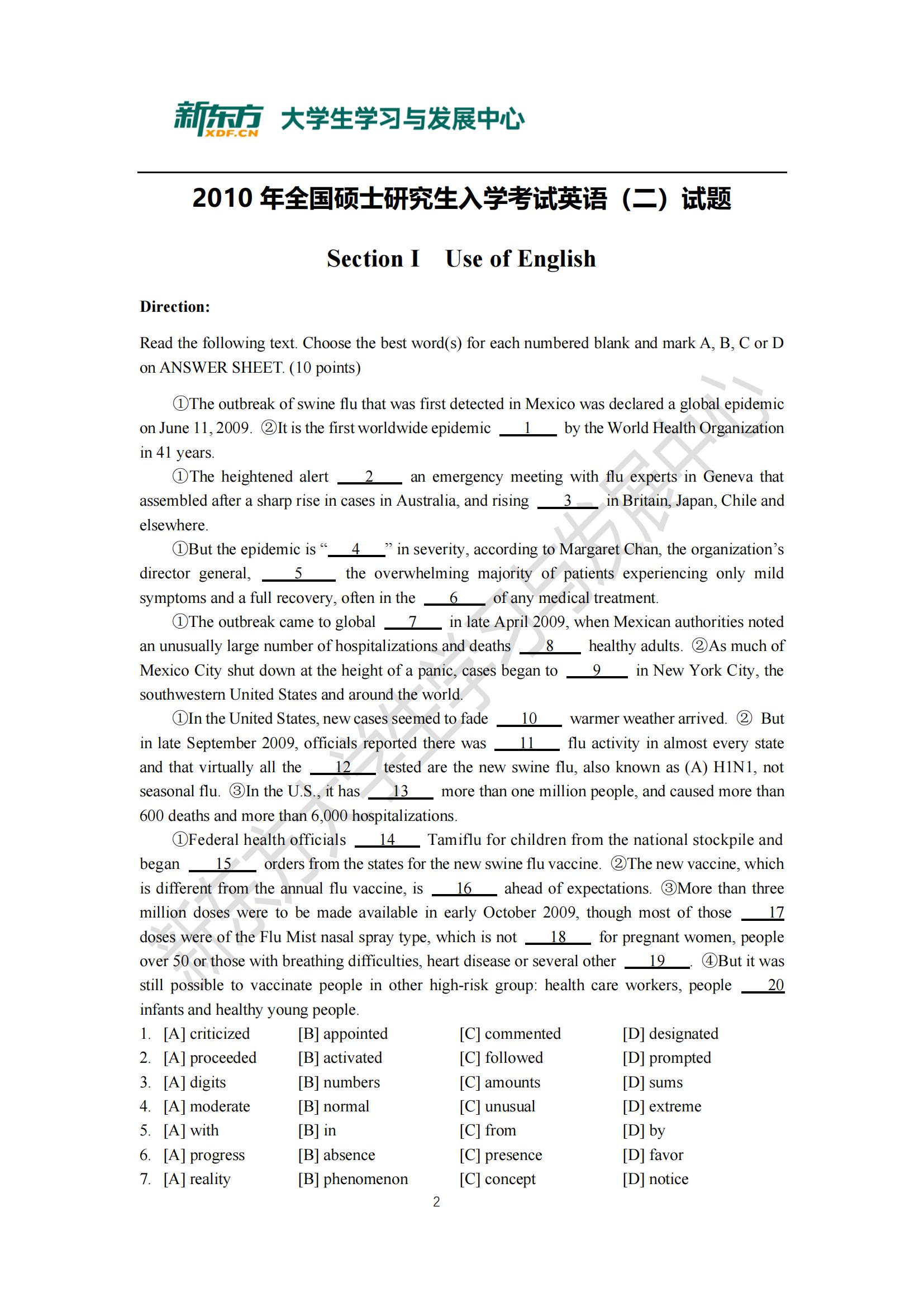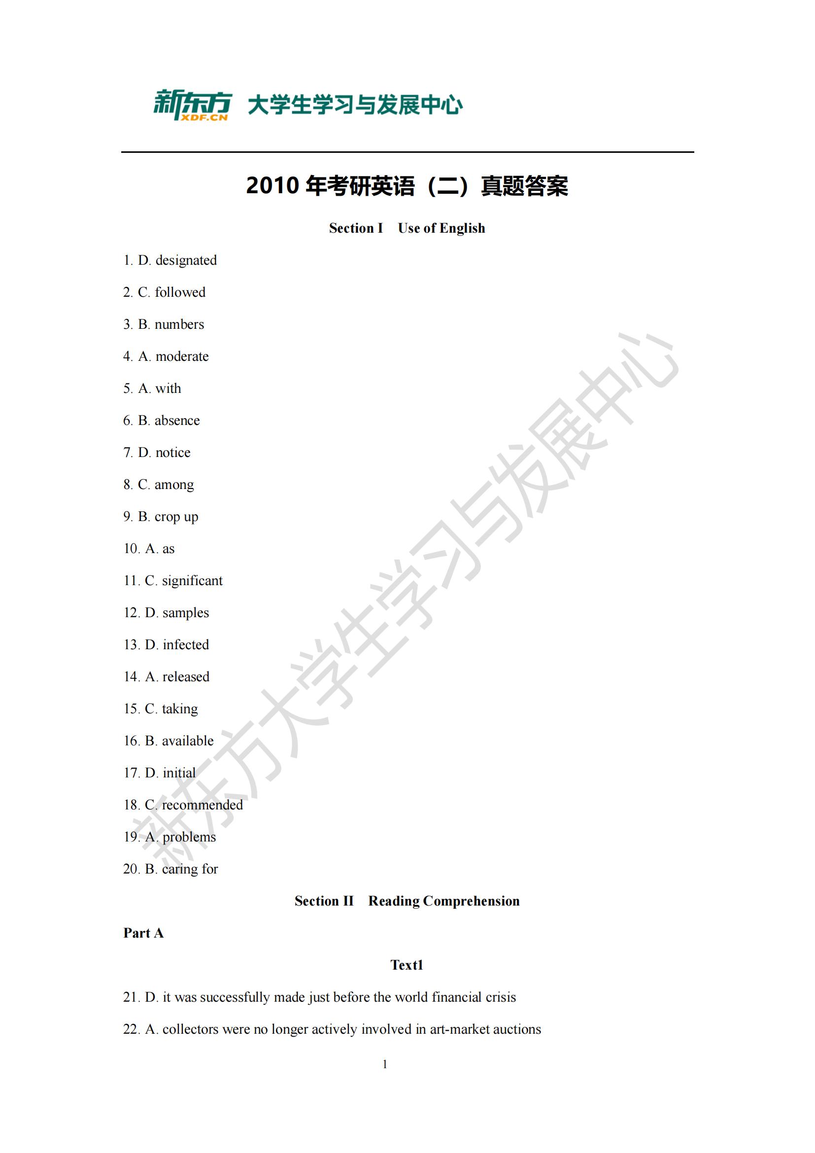 真题对于每位考研党来说是个非常重要的学习资料,多刷几遍真题能够帮助同学们查漏补缺、熟悉题型、培养做题习惯等。因此,浙江新东方在此为同学们提供了2010年考研英语(二)真题及答案,希望能够帮助大家更好的准备考研英语,通过不断的练习与总结,掌握重点,攻克难点。更多资料获取可点击新东方考研网联系在线老师进行咨询。