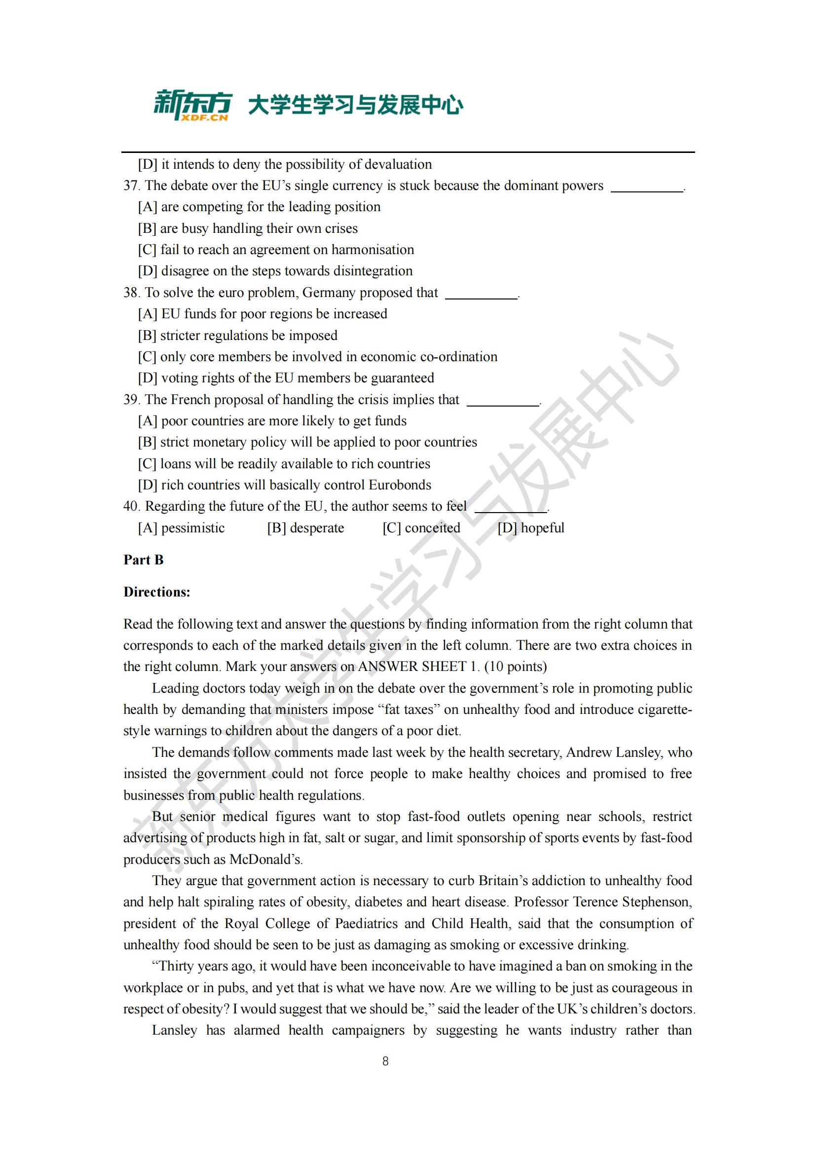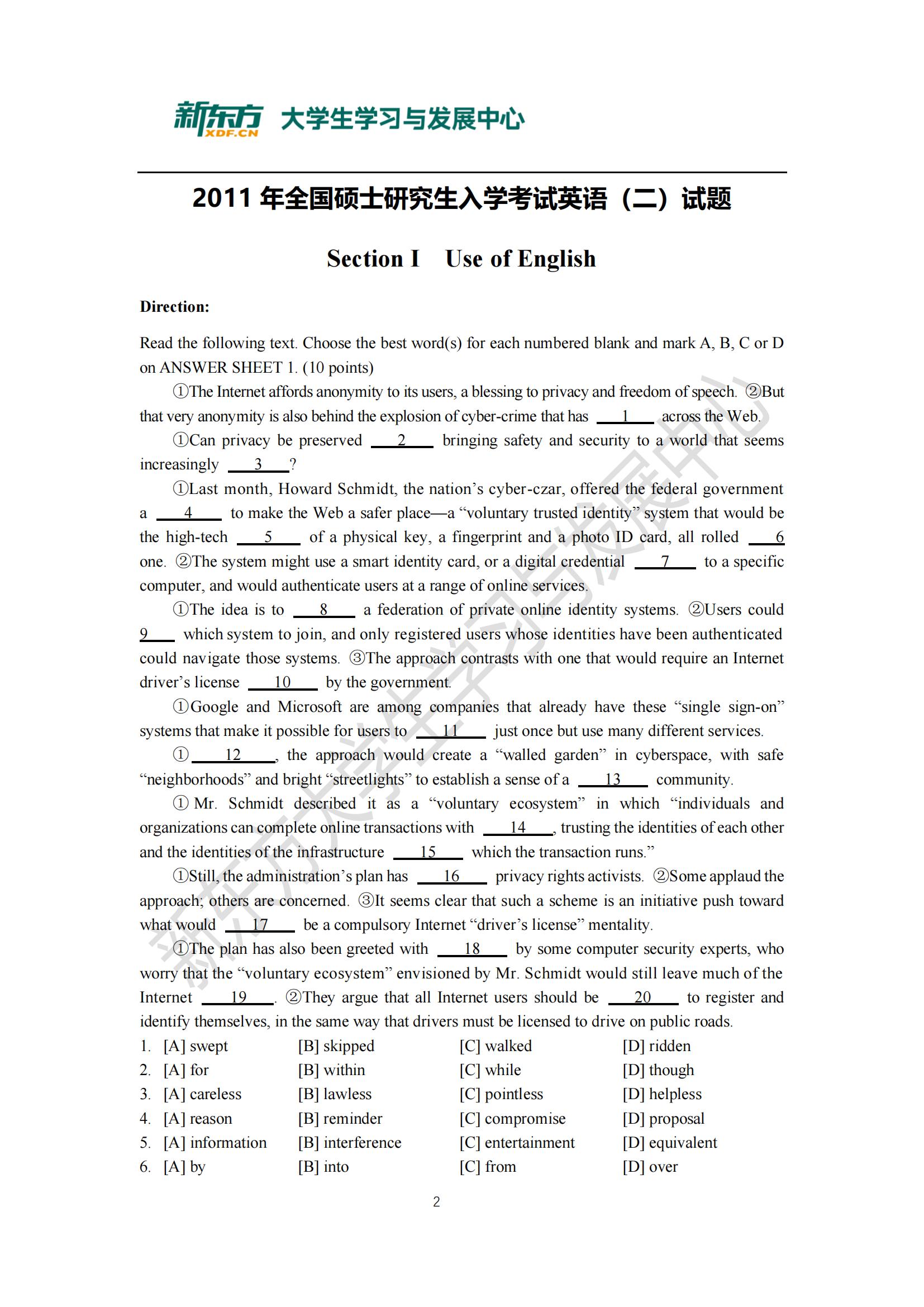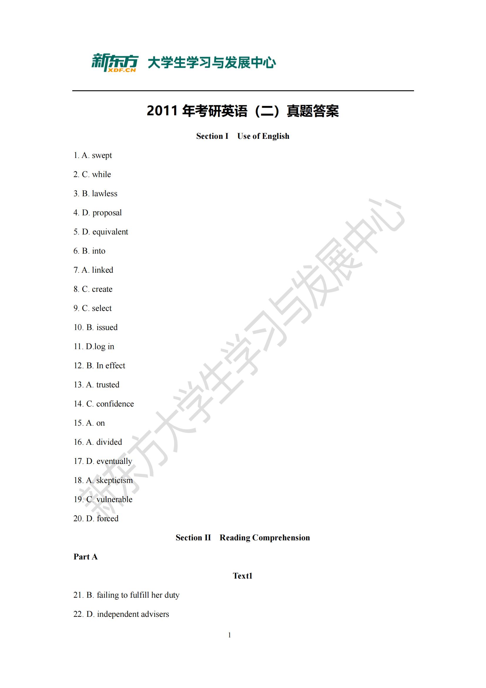 真题对于每位考研党来说是个非常重要的学习资料,多刷几遍真题能够帮助同学们查漏补缺、熟悉题型、培养做题习惯等。因此,浙江新东方在此为同学们提供了2011年考研英语(二)真题及答案,希望能够帮助大家更好的准备考研英语,通过不断的练习与总结,掌握重点,攻克难点。更多资料获取可点击新东方考研网联系在线老师进行咨询。