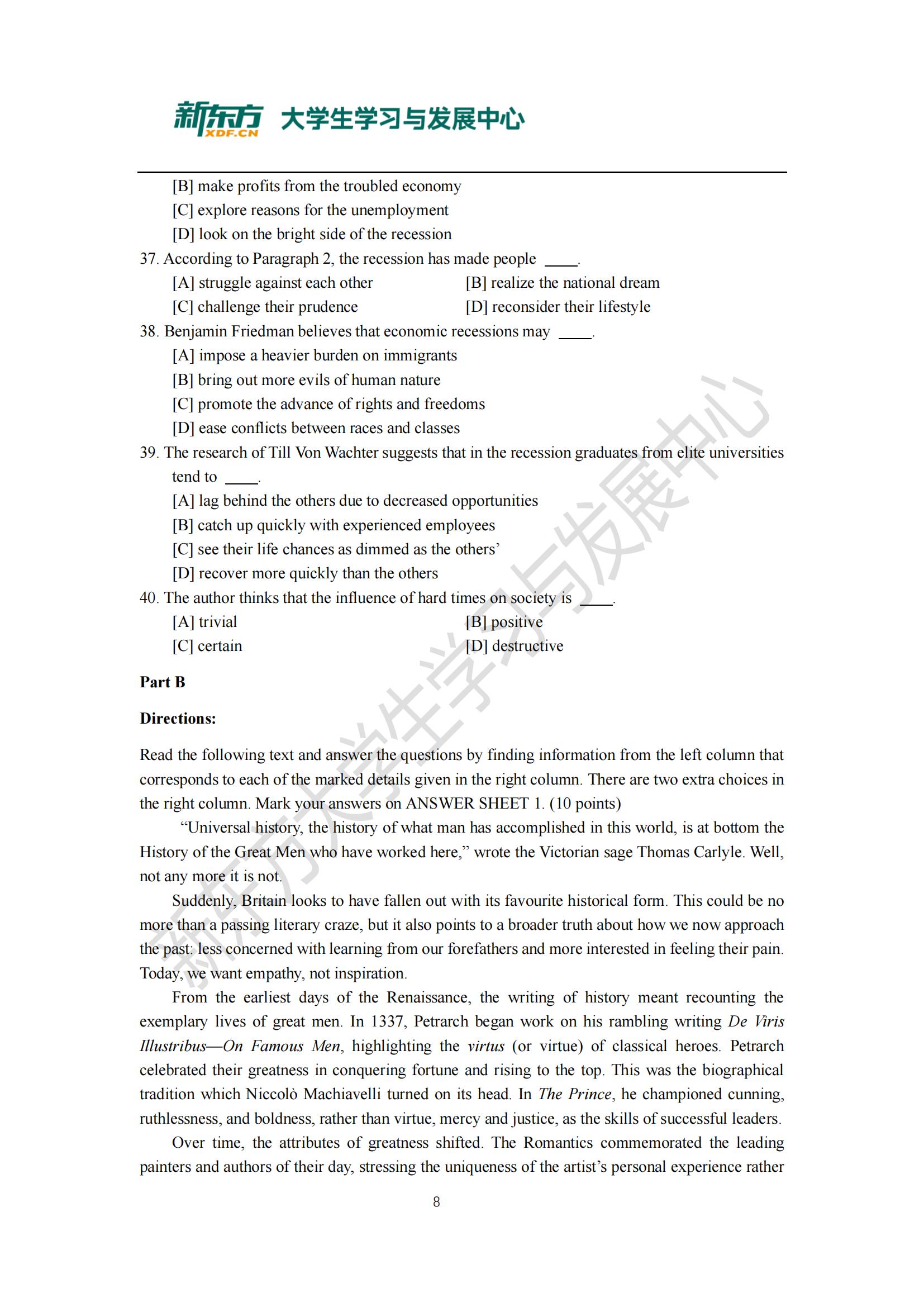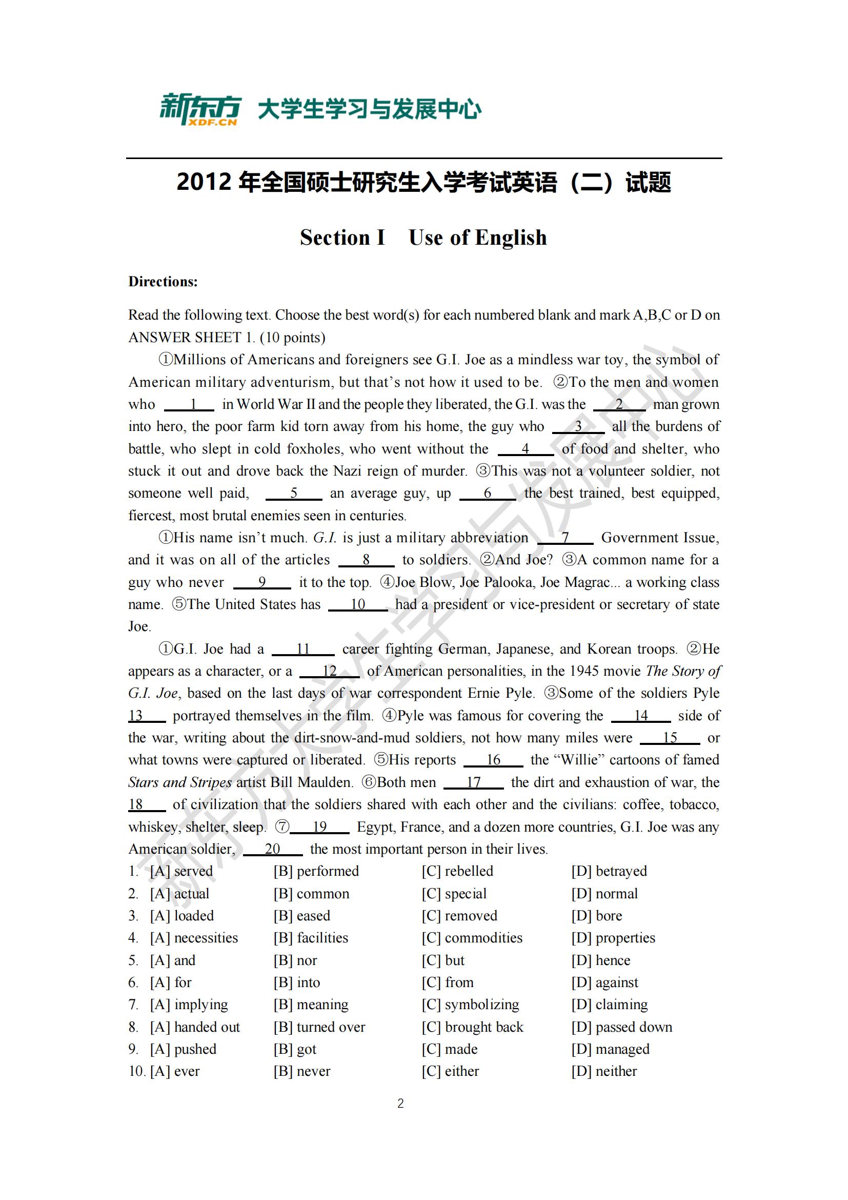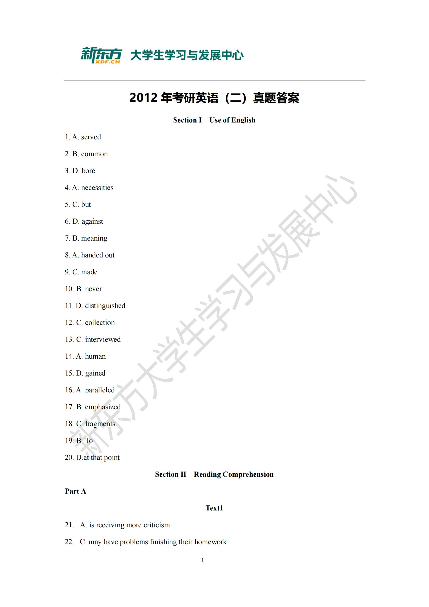 真题对于每位考研党来说是个非常重要的学习资料,多刷几遍真题能够帮助同学们查漏补缺、熟悉题型、培养做题习惯等。因此,浙江新东方在此为同学们提供了2012年考研英语(二)真题及答案,希望能够帮助大家更好的准备考研英语,通过不断的练习与总结,掌握重点,攻克难点。更多资料获取可点击新东方考研网联系在线老师进行咨询。