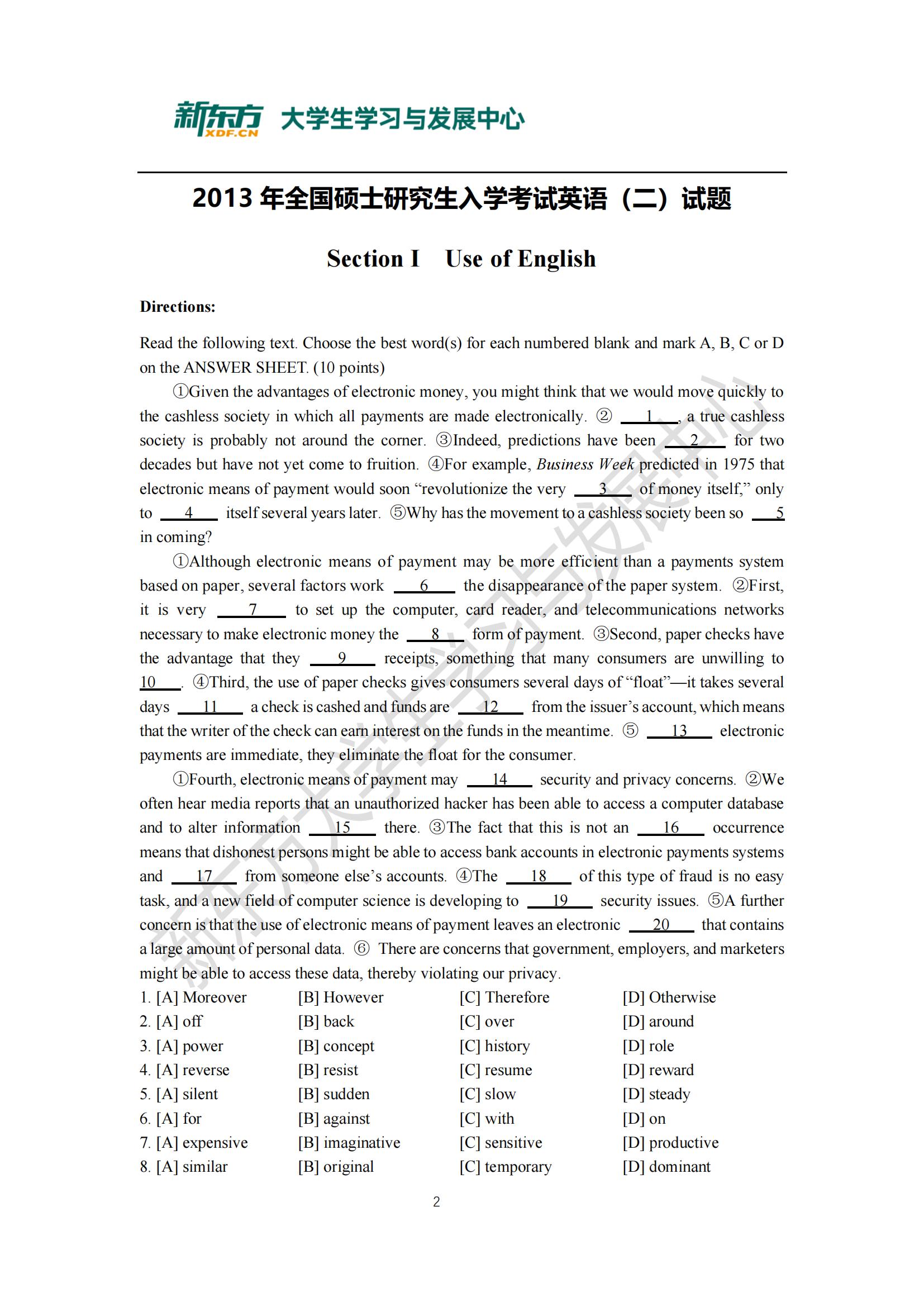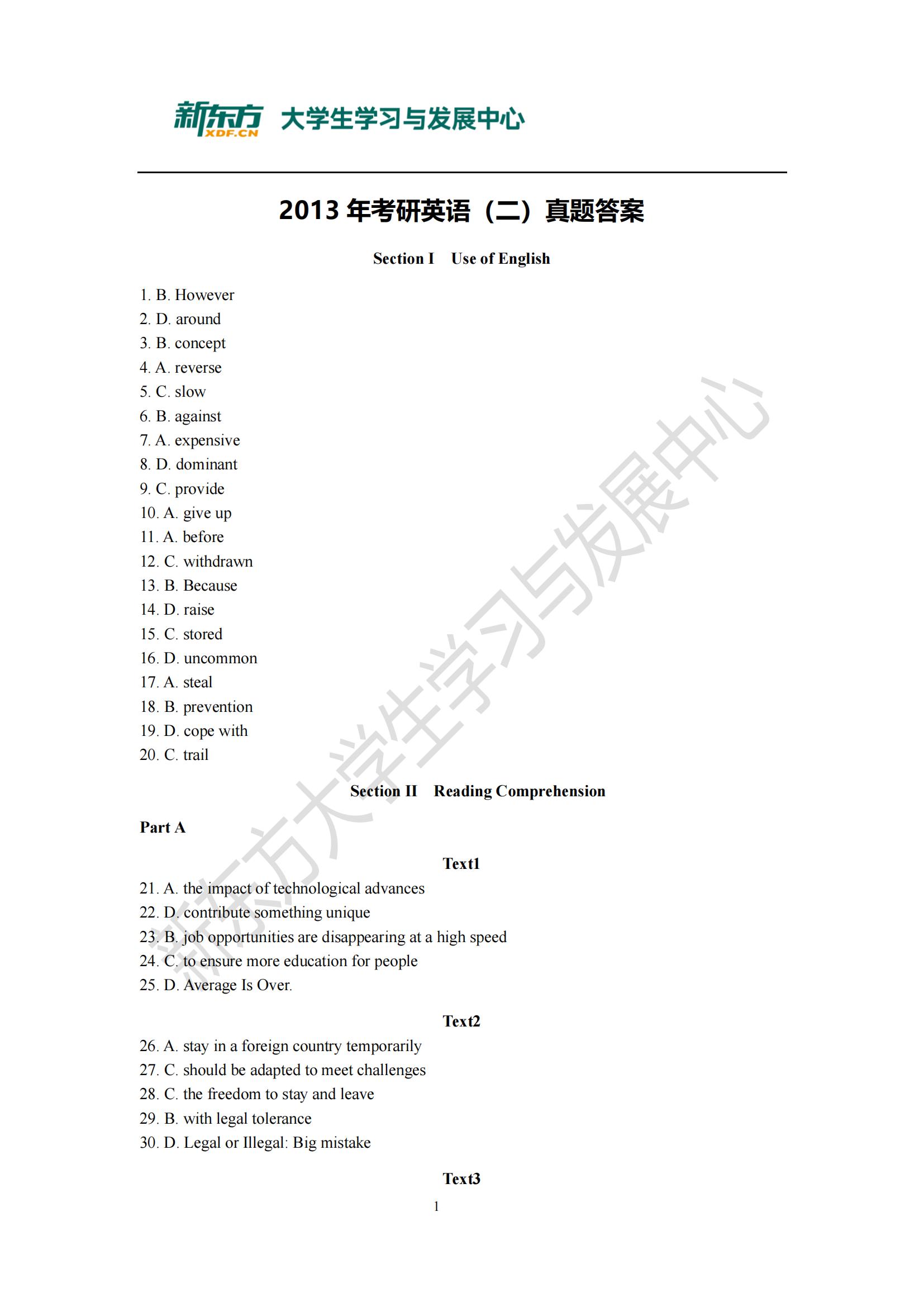 真题对于每位考研党来说是个非常重要的学习资料,多刷几遍真题能够帮助同学们查漏补缺、熟悉题型、培养做题习惯等。因此,浙江新东方在此为同学们提供了2013年考研英语(二)真题及答案,希望能够帮助大家更好的准备考研英语,通过不断的练习与总结,掌握重点,攻克难点。更多资料获取可点击新东方考研网联系在线老师进行咨询。