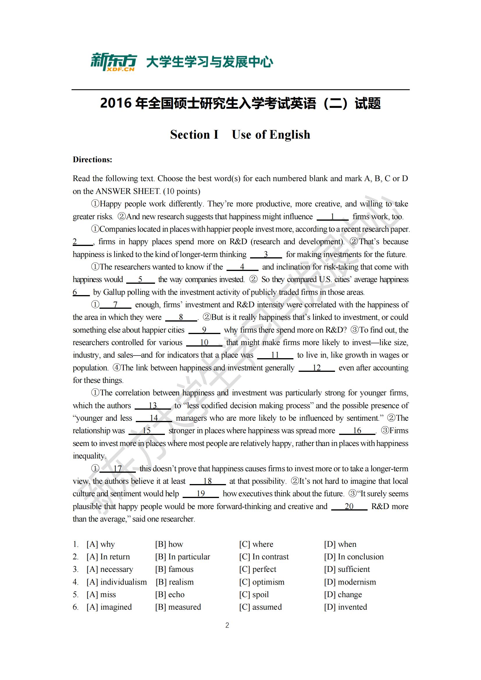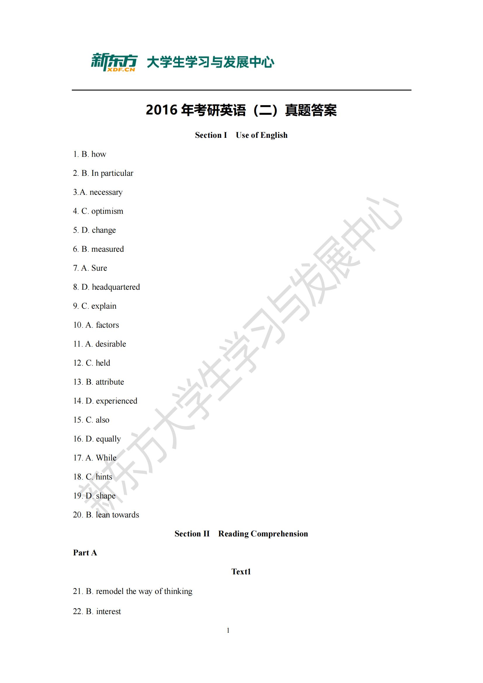 真题对于每位考研党来说是个非常重要的学习资料,多刷几遍真题能够帮助同学们查漏补缺、熟悉题型、培养做题习惯等。因此,浙江新东方在此为同学们提供了2016年考研英语(二)真题及答案,希望能够帮助大家更好的准备考研英语,通过不断的练习与总结,掌握重点,攻克难点。更多资料获取可点击新东方考研网联系在线老师进行咨询。