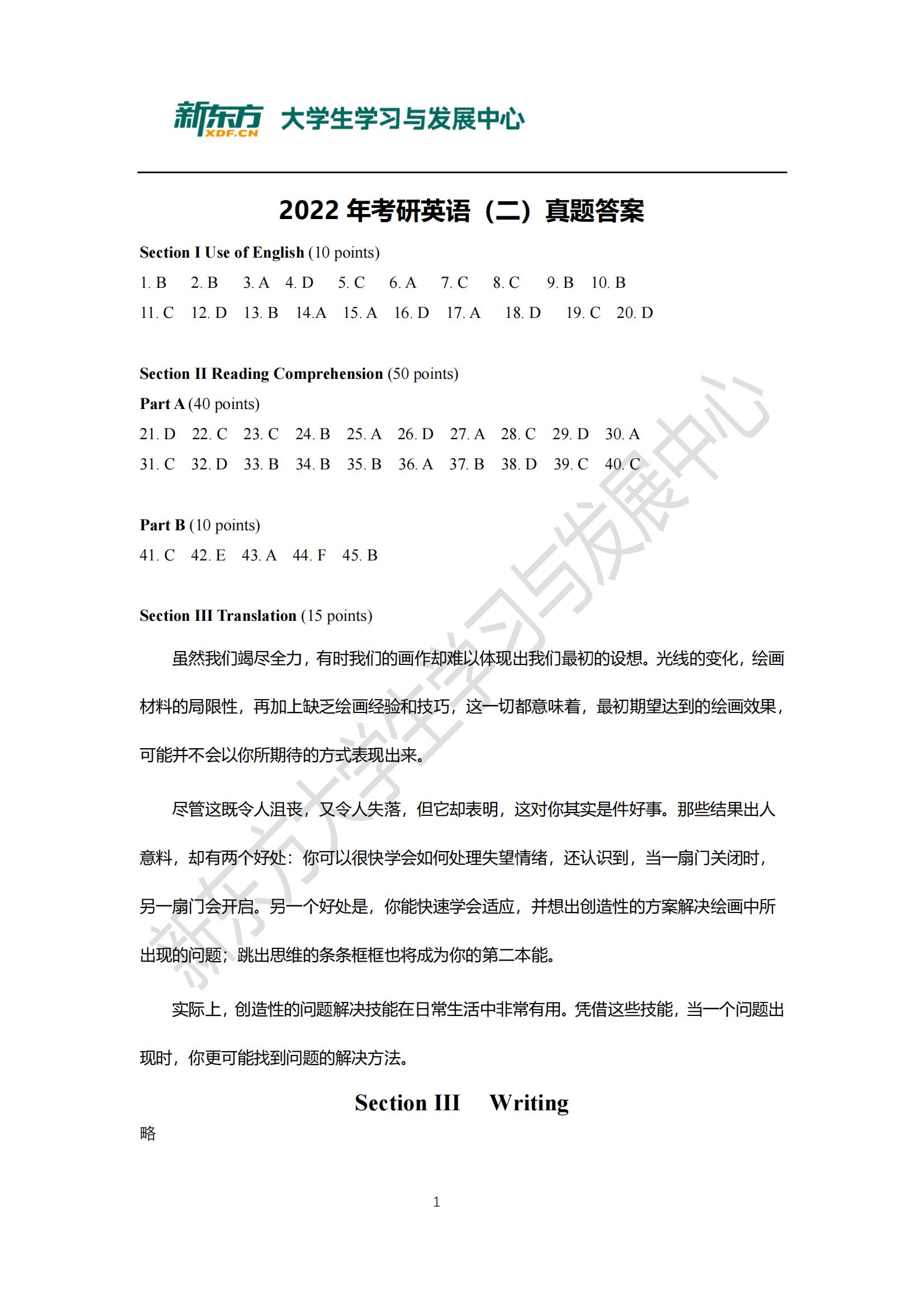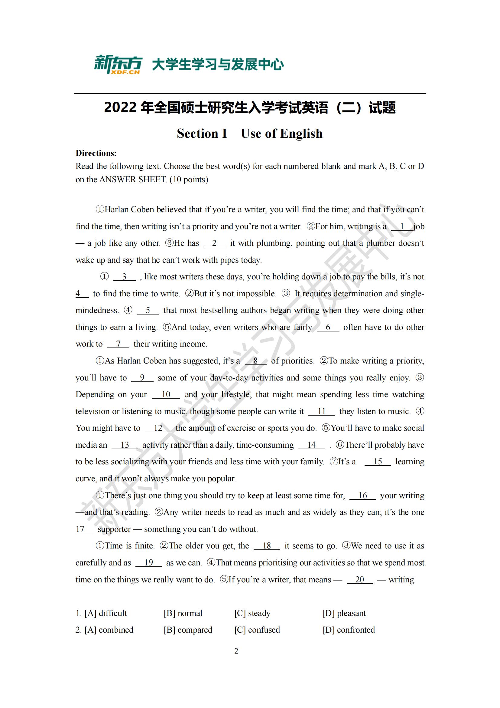 真题对于每位考研党来说是个非常重要的学习资料,多刷几遍真题能够帮助同学们查漏补缺、熟悉题型、培养做题习惯等。因此,浙江新东方在此为同学们提供了2022年考研英语(二)真题及答案,希望能够帮助大家更好的准备考研英语,通过不断的练习与总结,掌握重点,攻克难点。更多资料获取可点击新东方考研网联系在线老师进行咨询。
