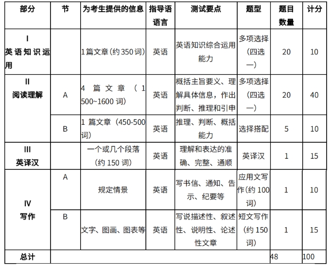 试题分四部分,包括英语知识运用、阅读理解、翻译和写作,共 48 小题。