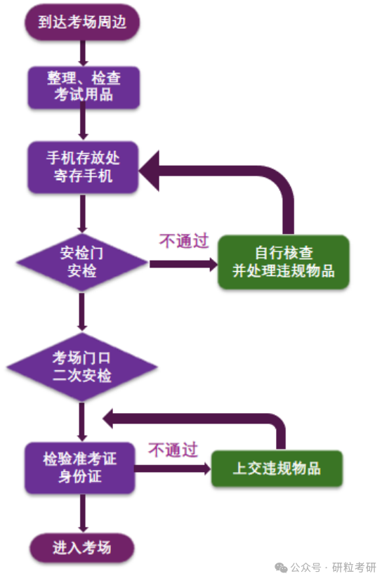 建议考生至少在每场考试开考前1小时(上午7:30,下午13:00)到安检入口,按照指定安检通道,有序排队、等候智能安检。安检具体要求可扫码查看??