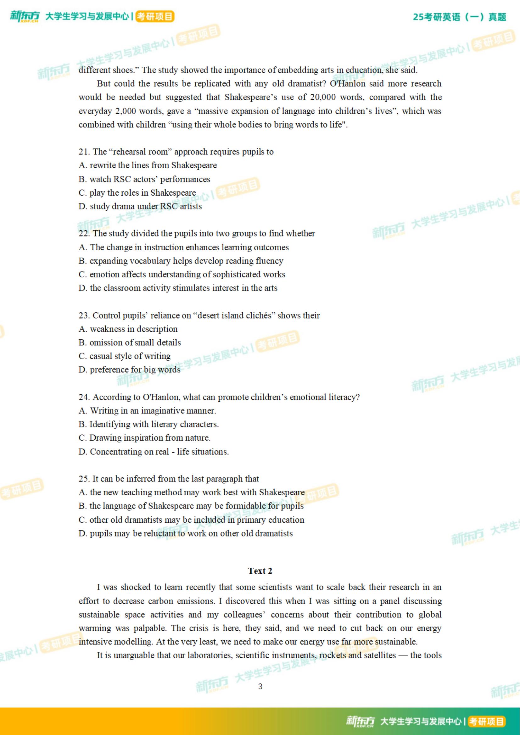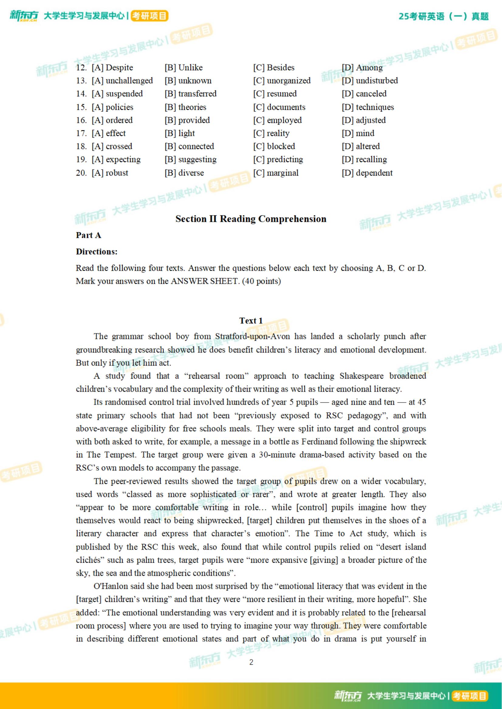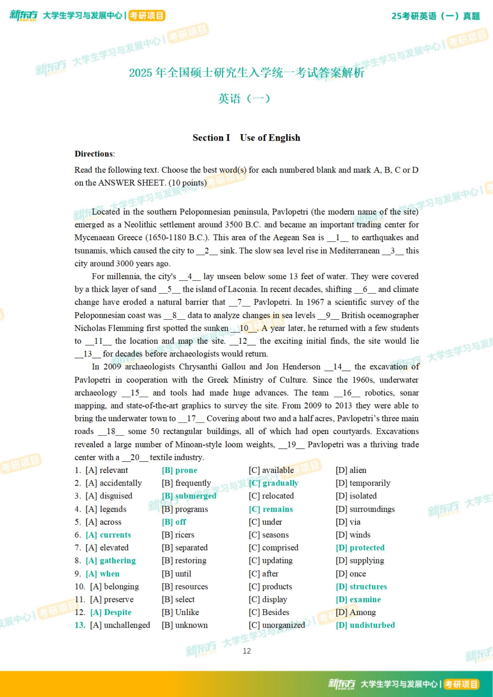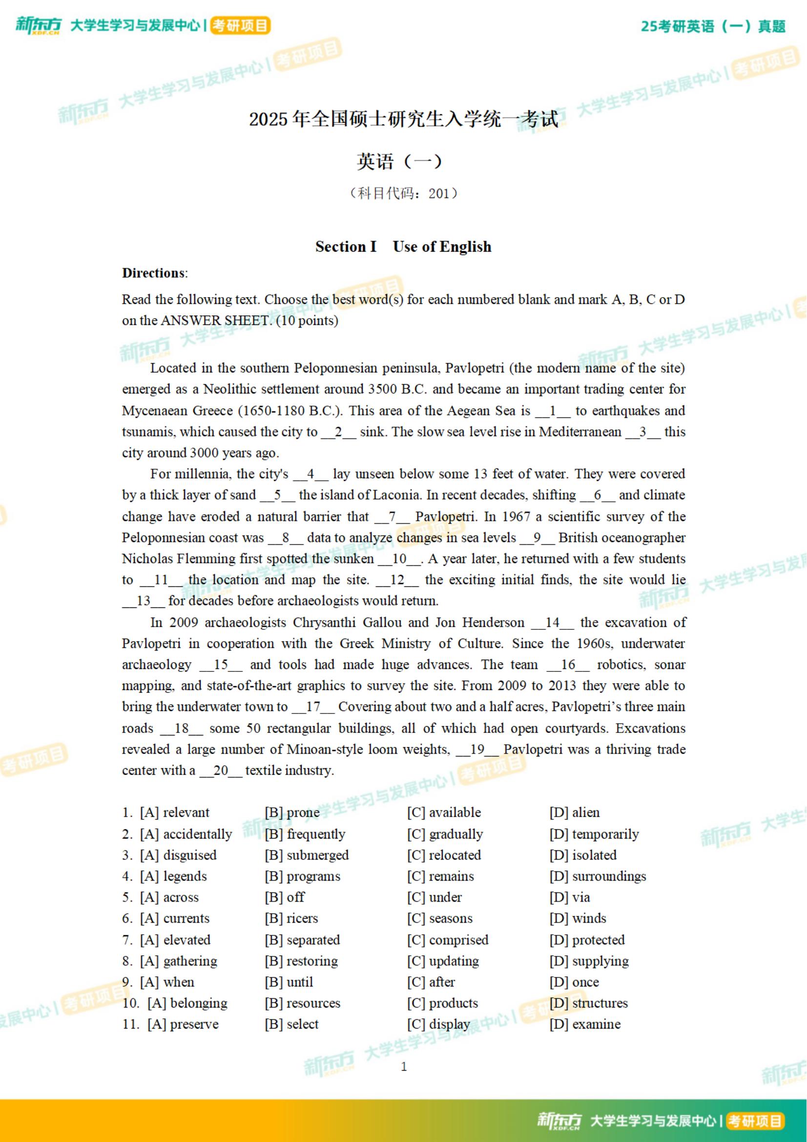 真题对于每位考研党来说是个非常重要的学习资料,多刷几遍真题能够帮助同学们查漏补缺、熟悉题型、培养做题习惯等。因此,浙江新东方在此为同学们提供了2025年考研英语(一)真题及答案,希望能够帮助大家更好的准备考研英语,通过不断的练习与总结,掌握重点,攻克难点。更多资料获取可点击新东方考研网联系在线老师进行咨询。