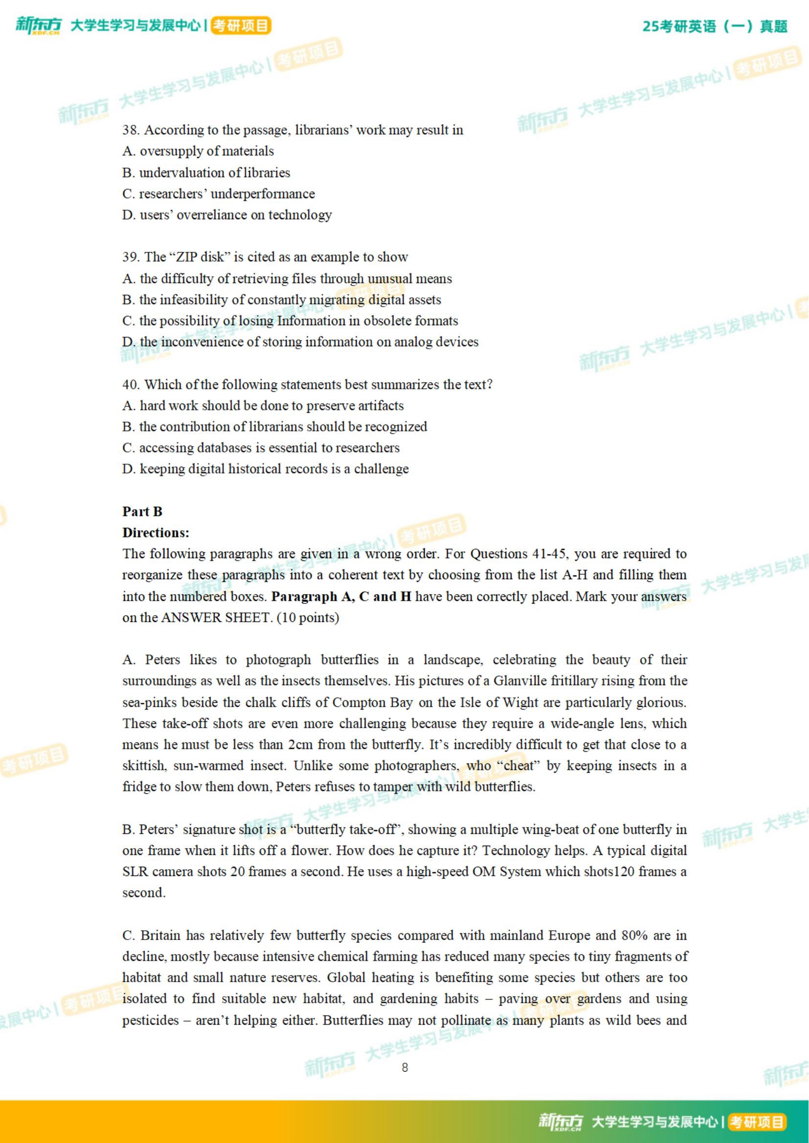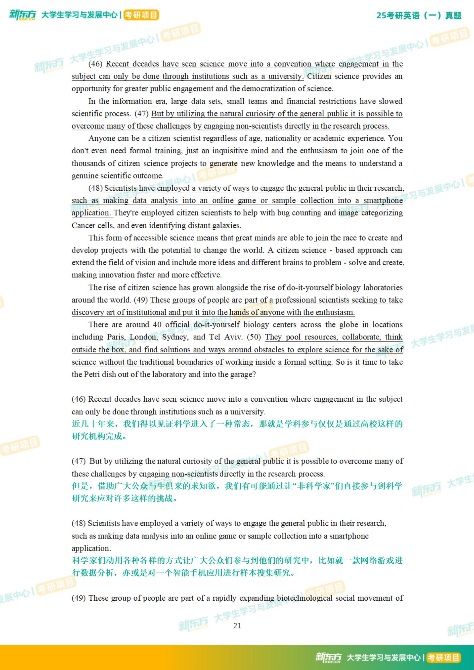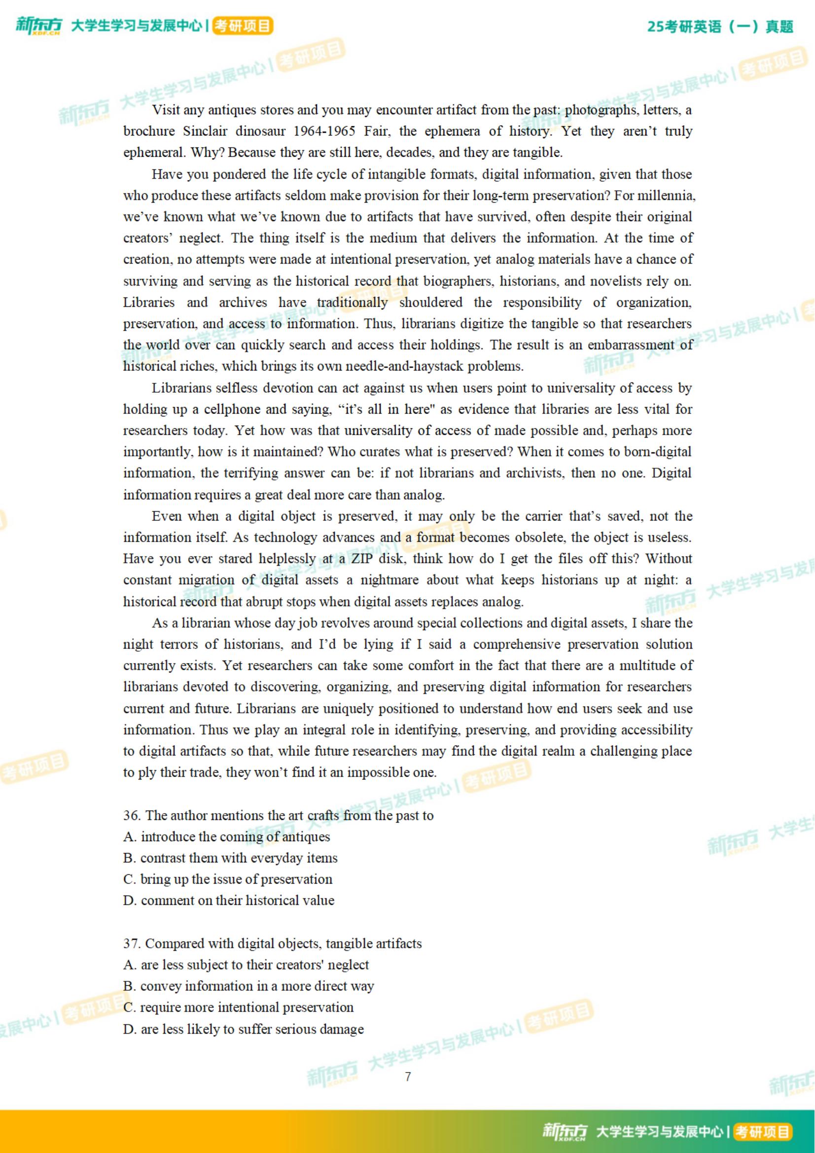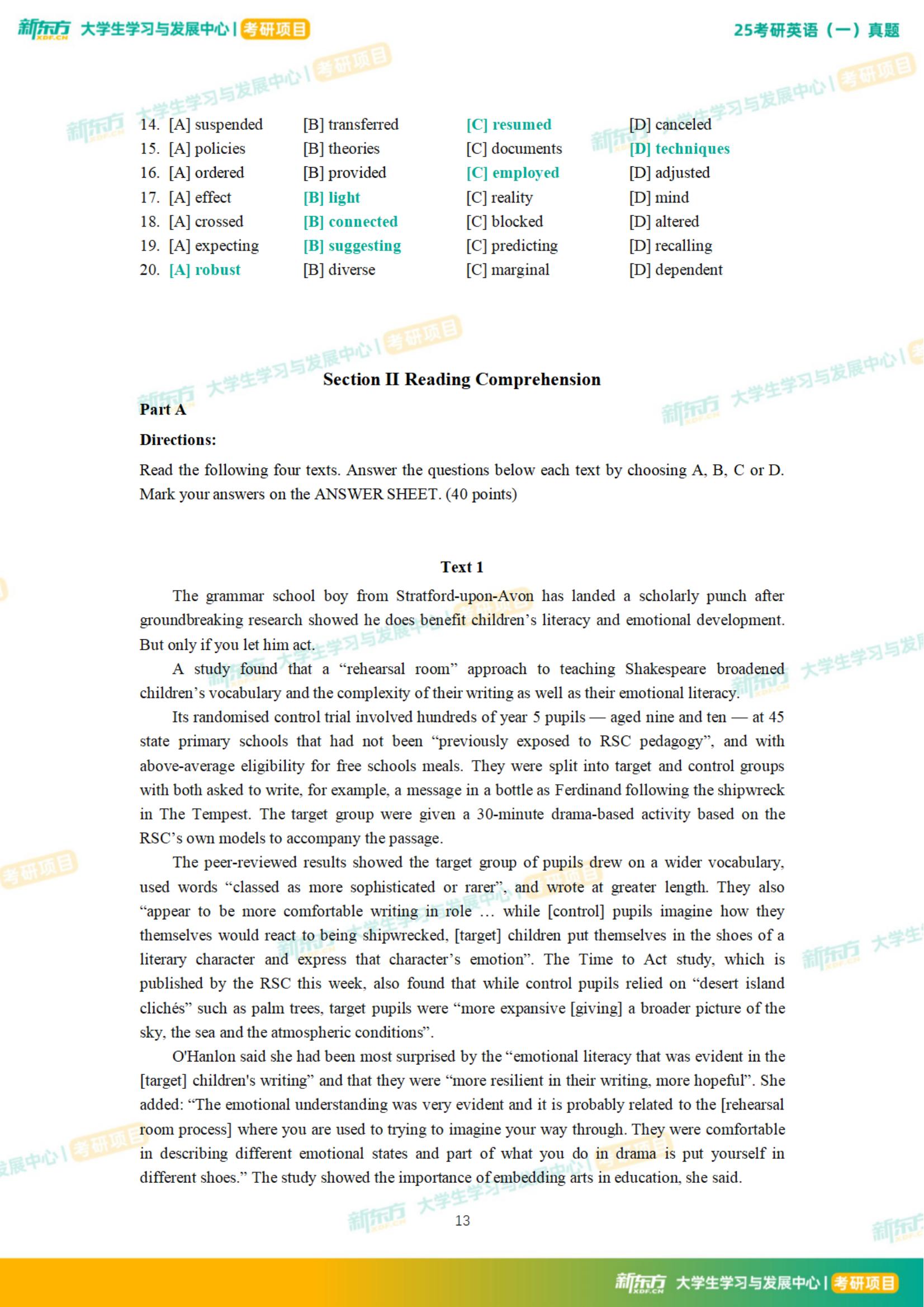 真题对于每位考研党来说是个非常重要的学习资料,多刷几遍真题能够帮助同学们查漏补缺、熟悉题型、培养做题习惯等。因此,浙江新东方在此为同学们提供了2025年考研英语(一)真题及答案,希望能够帮助大家更好的准备考研英语,通过不断的练习与总结,掌握重点,攻克难点。更多资料获取可点击新东方考研网联系在线老师进行咨询。