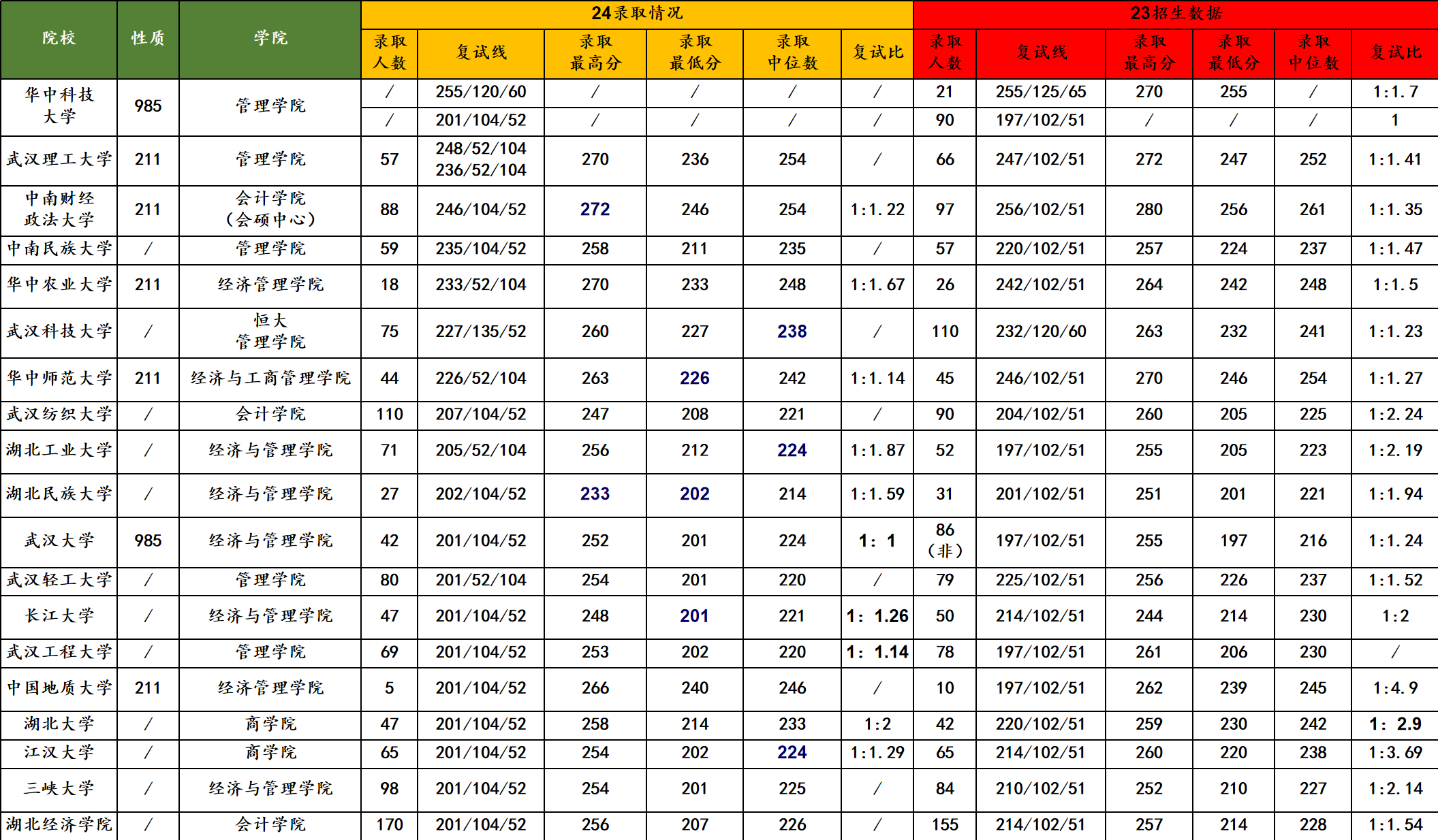 4.华中农业大学会计专硕为23年新增院校,复试比更高,建议目标分数245+左右。