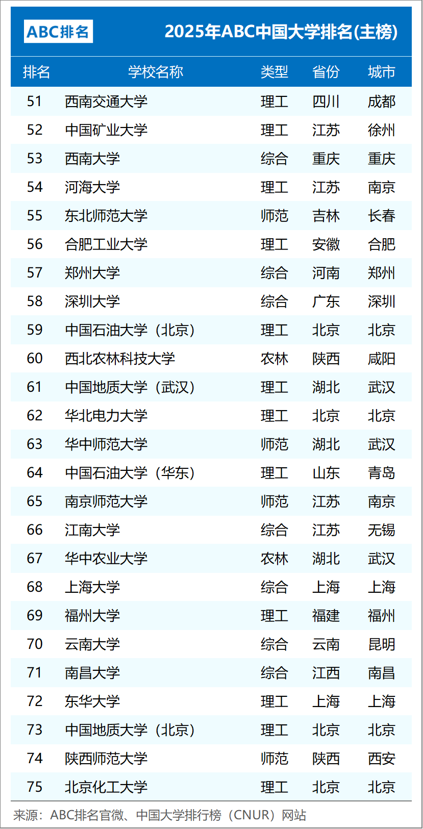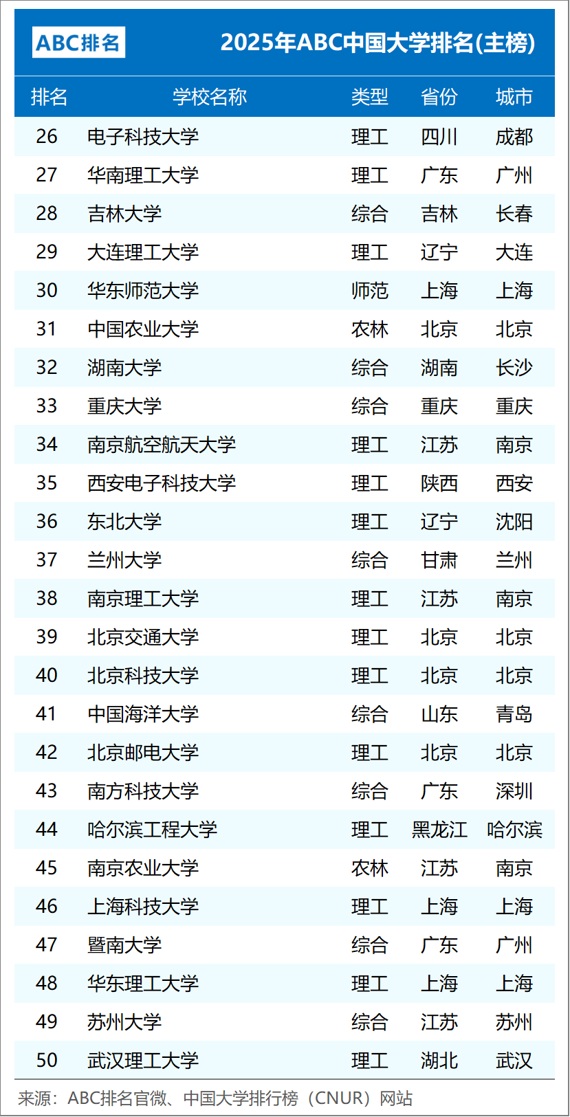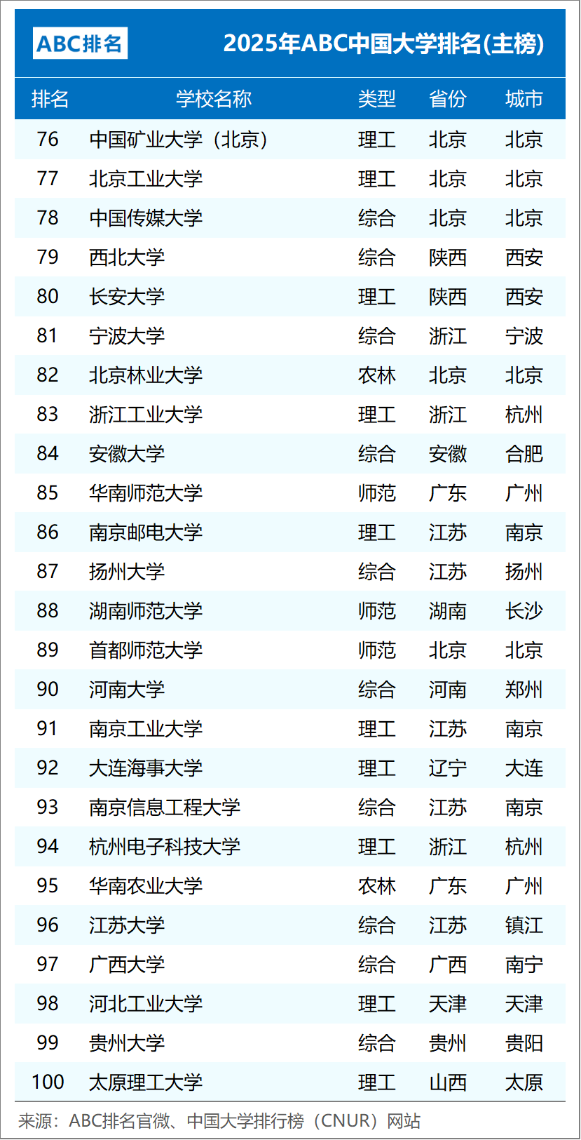2025年ABC中国大学排名结果显示,清华大学、北京大学位居全国前二,浙江大学、中国科学技术大学并列第3,复旦大学、上海交通大学、南京大学并列第5,中国人民大学第8,哈尔滨工业大学第9,北京航空航天大学第10。其中,哈尔滨工业大学时隔4年,再次归位全国前十。