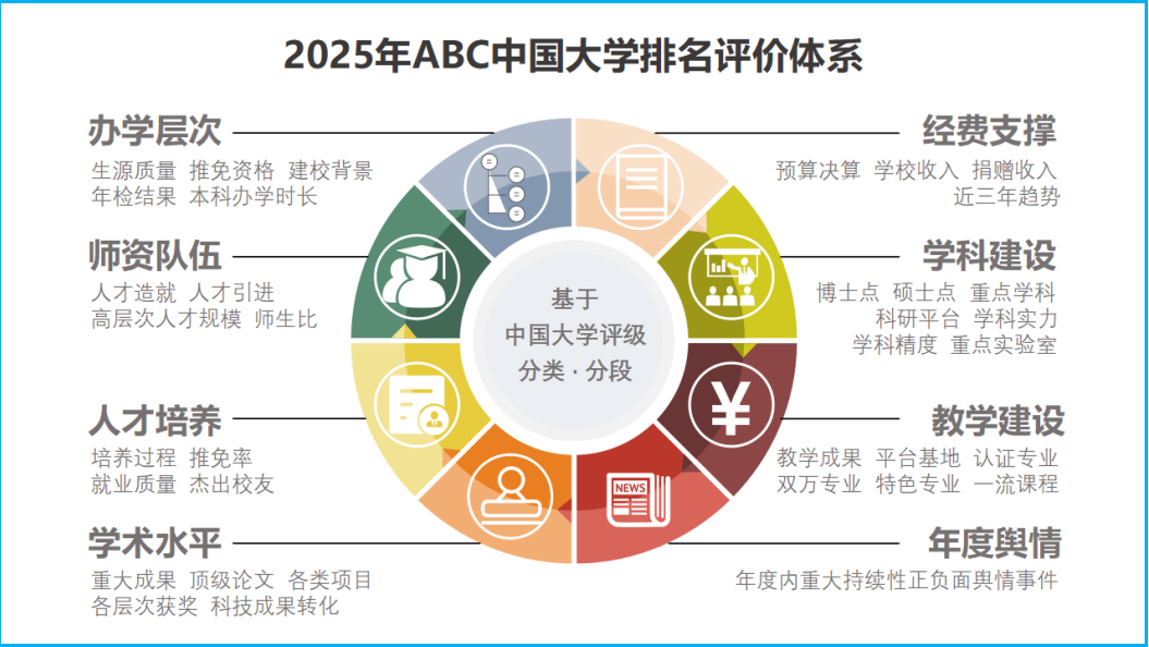 本年度排名延续采用本科生教育和研究生教育指标相融合、总量和质量、共性和特色指标统筹考虑的核心思想,指标共设八大模块:办学层次、经费支撑、学科建设、教学建设、师资队伍、学术水平、人才培养以及年度舆情,本年度增加了科技成果转化、认证专业等二级指标。
