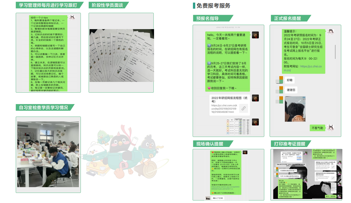 从备考、初试到复试,分为导学、基础、强化、冲刺阶段,摸底测试、全程督学、阶段测评、全真模拟、心理关怀,让每一位同学都能体验考研过程中,全程有规划,课程有针对,服务有体系,能够无忧备考的安心感。
