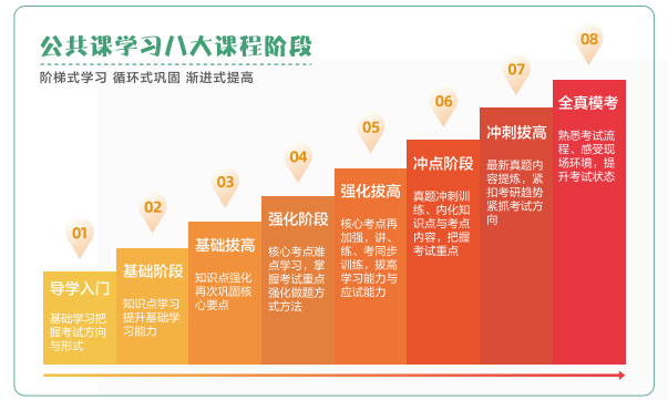 从备考、初试到复试,分为导学、基础、强化、冲刺阶段,摸底测试、全程督学、阶段测评、全真模拟、心理关怀,让每一位同学都能体验考研过程中,全程有规划,课程有针对,服务有体系。