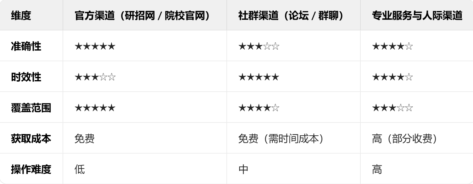 黄金组合:以研招网为核心,院校官网为补充,社群渠道为辅助,人脉资源为突破口。