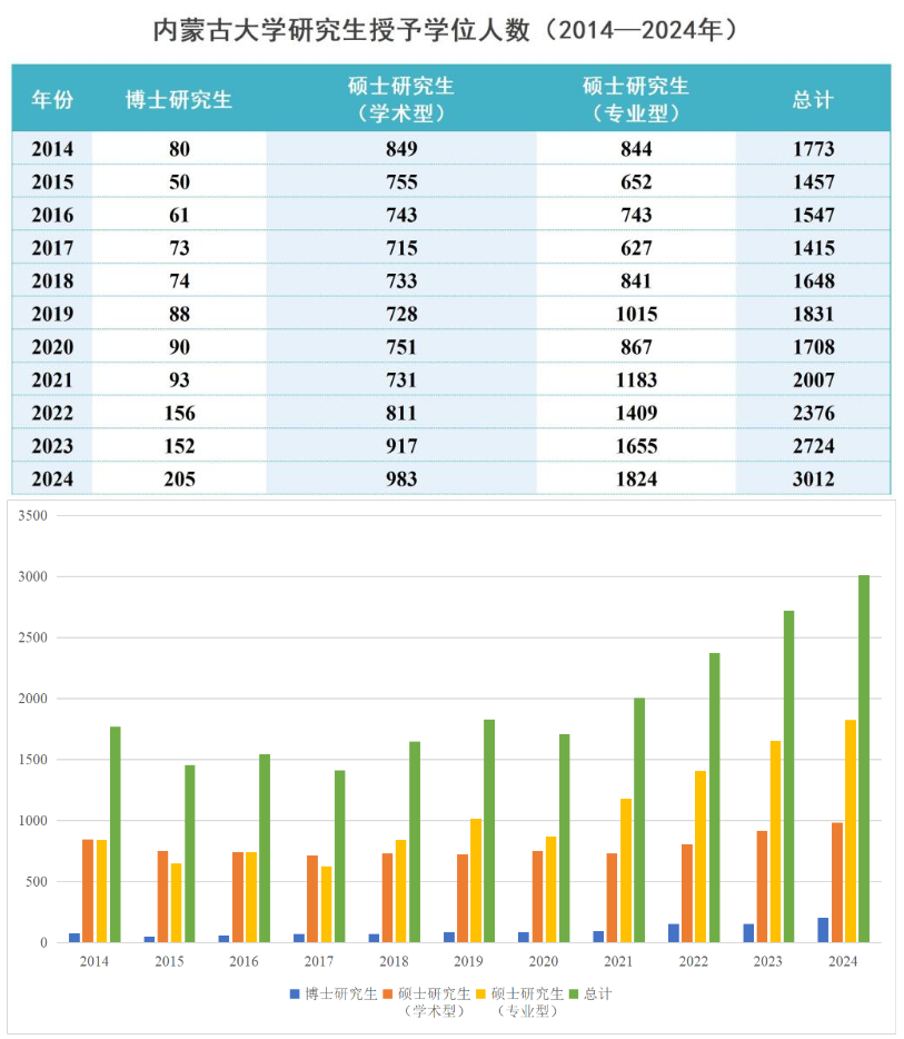 内蒙古大学研究生授予学位人数统计(2014——2024年)