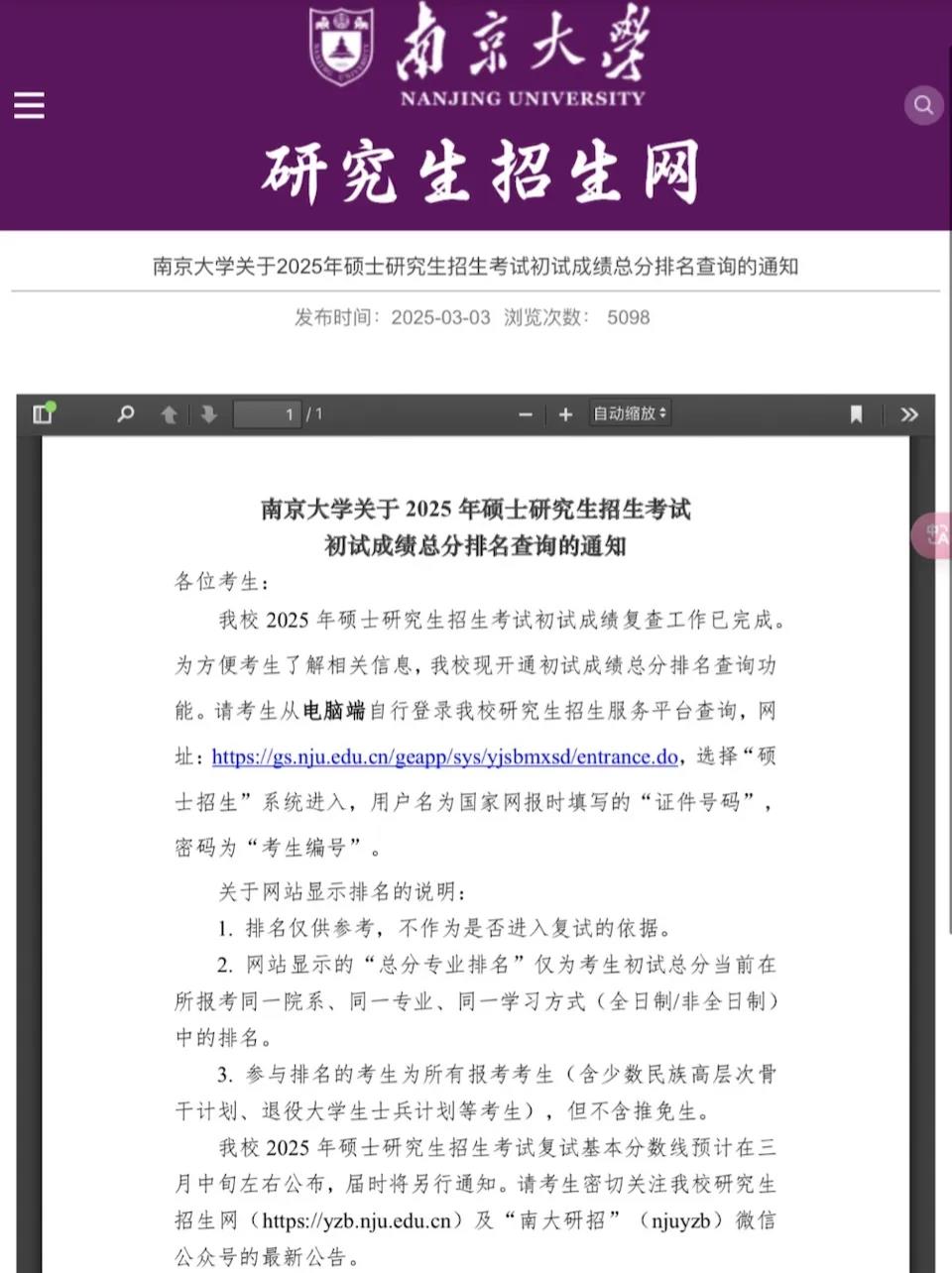 南京大学发布了2025年硕士研究生招生考试初试成绩总排名查询通知。