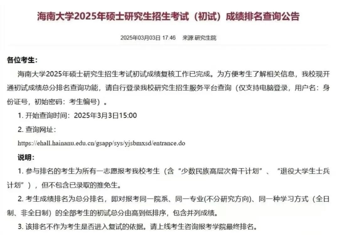 海南大学2025年硕士研究生招生考试初试成绩复核工作已完成,我校现开通初试成绩总分排名查询功能。