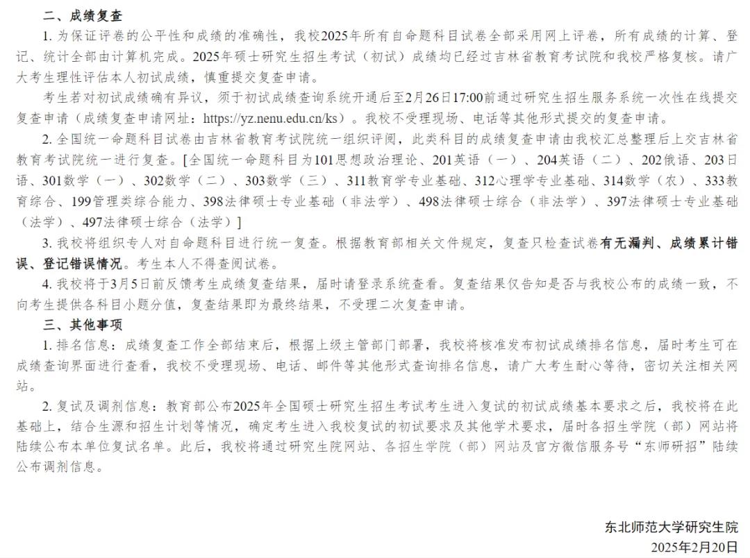 东北师范大学将于3月5日前反馈考生成绩复查结果,复查工作结束后将发布排名信息。