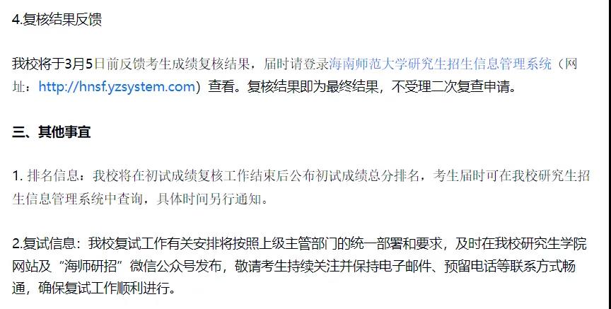 海南师范大学将于3月5日前反馈考生成绩复核结果,并在复核工作结束后公布初试成绩排名。