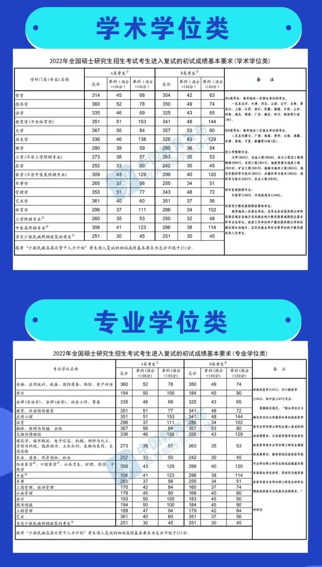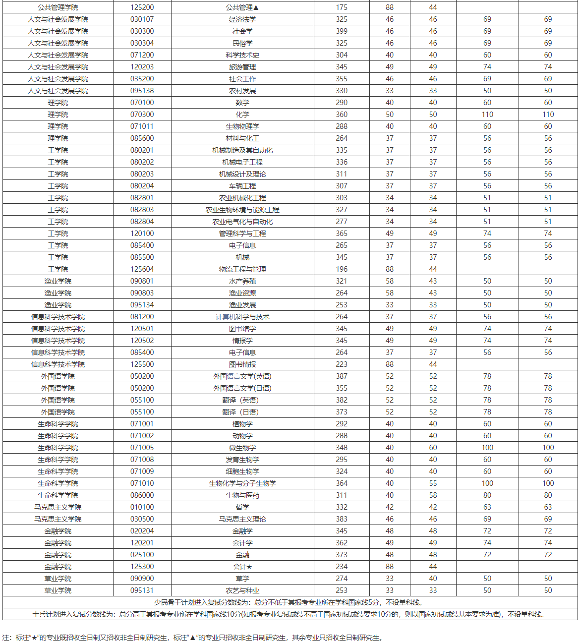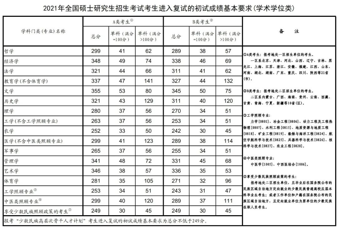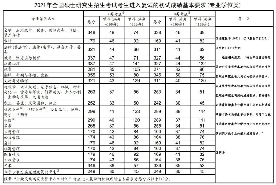 “退役大学生士兵计划”考生的初试总成绩须高于其报考专业A类国家线上20分(如报考专业普通计划考生复试总分要求不高于A类国家线上20分的,则以普通计划考生复试总分要求为准)且单科成绩不低于报考专业普通计划A类国家线;“少数民族高层次骨干人才计划”考生的初试总成绩不低于“少数民族高层次骨干人才计划”A类国家线且单科成绩不低于报考专业普通计划A类国家线。