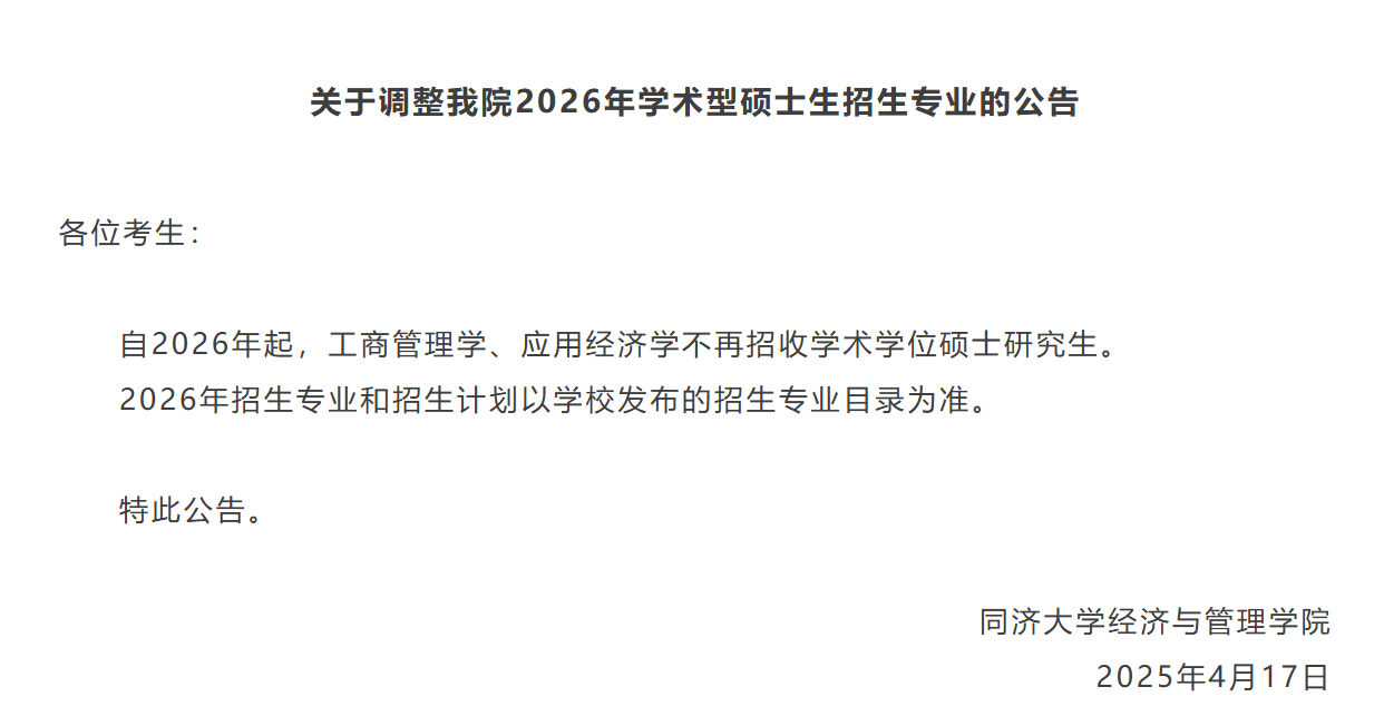 另外,同济大学经济与管理学院也发布了关于调整 2026 年学术型硕士生招生专业的公告,从 2026 年起,工商管理学、应用经济学这两个专业不再招收学术学位硕士研究生: