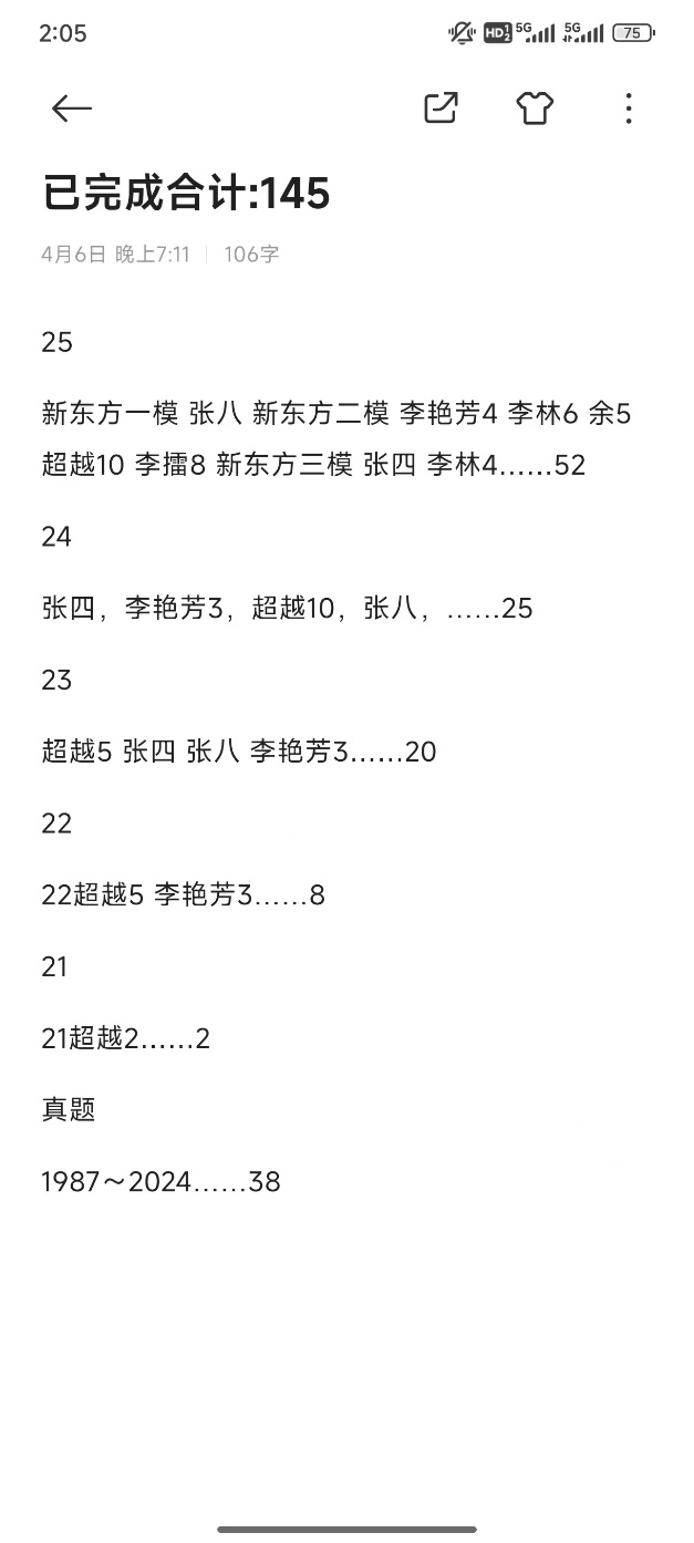 其次,我想简单说一下数学的学习。对于工科学生,很多时候决定考不考得上的都是数学。在这里可以很开心的跟大家说,即使是985.工科学生的英语水平也不是很高。想必很多人都被英语折磨的头昏脑胀,但是这并不是说你可以不好好学,只是告诉各位这块不会拉你太多分数。如果不好好学,还是可能低别人几十分甚至不能过线。说一下本人的数学经历,一开始十分焦虑,不知道自己数学能不能达到要求,好在有新东方的老师进行了耐心的劝导。这里也劝各位,少一些不必要的焦虑,学到后面根据自己情况再做决定即可,只要努力就行。当然适当的压力推人进步,所以也建议前期有个小目标。数学前期的学习,建议跟着新东方或者其他适合你的老师,写一写三大计算、660等练习册,暑假前可学一遍张宇的课程,刷完1000题基础部分。到了暑假是学习的最关键时期,这里想必大家已经开始强化学习了,数学怎么学想必有了一定判断,我建议多涉猎,各位老师皆有可取之处,刷完880、1000题,有能力可以再追加李艳芳900(我没有写李艳芳,代替为强化36讲,由于大多人对该书持贬低态度,故不推荐)。在这些完成之后可以开始刷真题了解自己实力,刷完近几年真题之后可以开始刷模拟卷,力推超越卷,尽量多刷。早年真题可以当作习题册去做,没有模考的必要,但是建议写一写。最后,通过以上这些我数一取得了142的高分,这样说是不是觉得方法可靠多了。附上我做过的模拟卷以作参考。