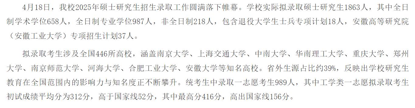 2025 年实际录取 1863 人,扩招趋势明显,统考生中一志愿录取 989 人,占比 53.09%。该校省外生源占比 39%,工学类一志愿考生平均分高于国家线 52 分,显示出优势学科的吸引力。