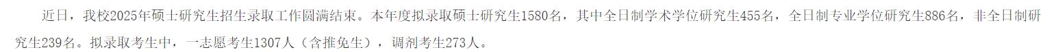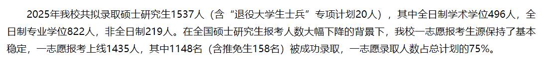 江西农业大学 2025 年拟录取 1537 人(含专项计划 20 人),一志愿录取人数占总计划的 75%。在全国考研人数下降的背景下,学校通过 “四严” 举措(严抓政策执行、严管复试流程、严守工作纪律、严把信息公开)稳定一志愿生源。校领导 “亲自把关、协调、督查”,校纪委全程监督,各部门协同联动,形成党政领导主抓、导师全程参与的工作格局,确保一志愿考生录取比例稳居高位。