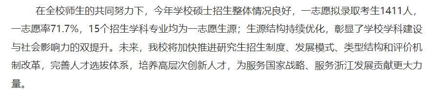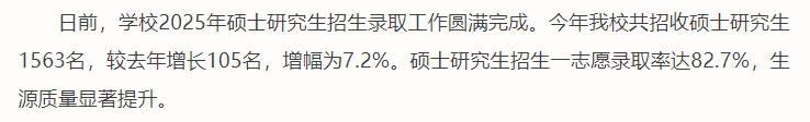 作为浙江省重点建设高校,浙江财经大学 2025 年硕士研究生招生规模达 1563 人,较 2024 年增加 105 人,增幅 7.2%。其中,一志愿录取率高达 82.7%,生源质量显著提升。学校在复试环节注重考生体验,校长魏江亲临现场督导,各学院提供 “暖心服务”,从考场环境到流程管理均展现出对招生工作的高度重视。其 “以考生为中心” 的服务理念,不仅赢得考生好评,也为一志愿考生提供了稳定的录取保障。