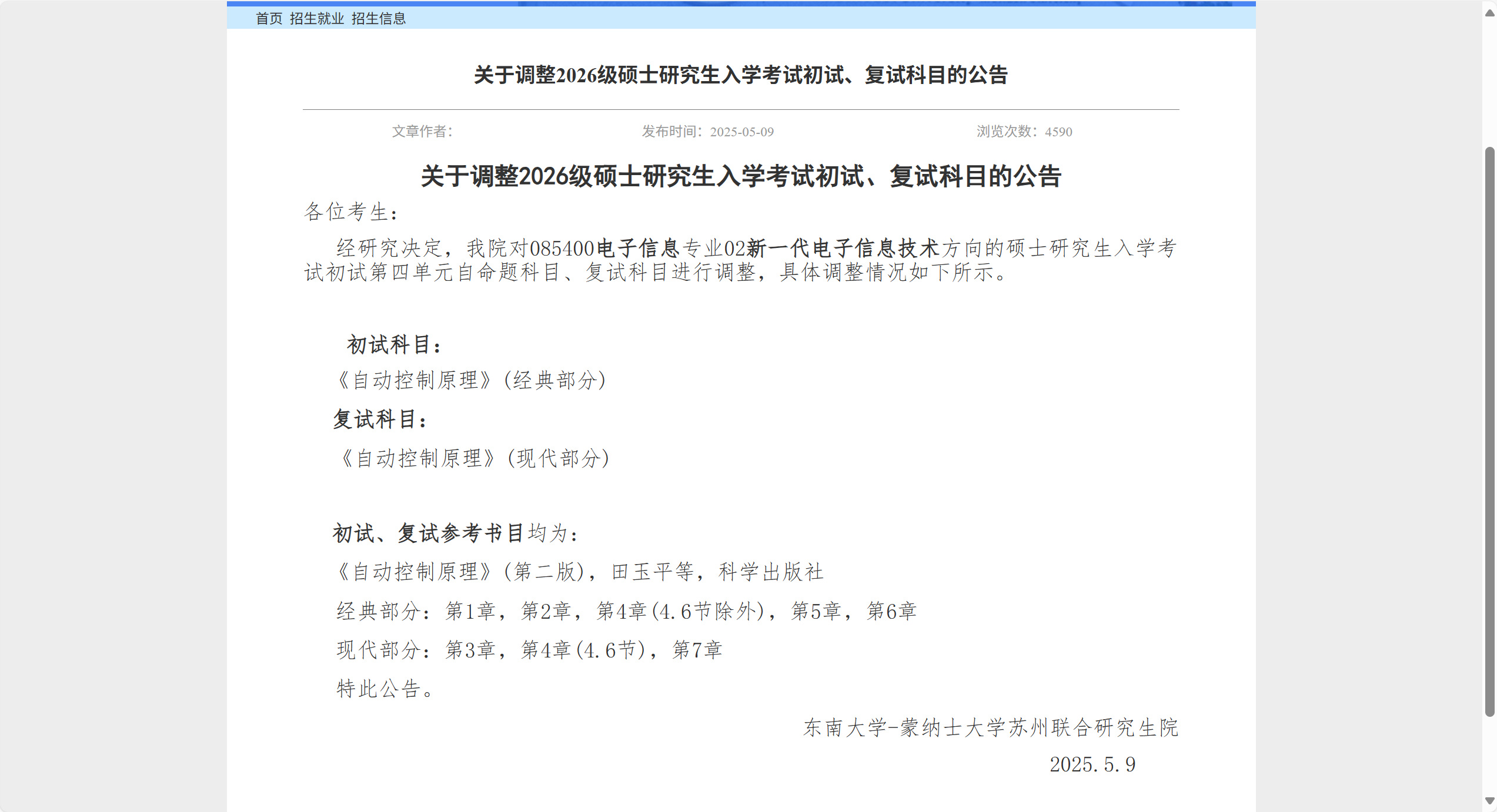 经研究决定,我院对085400电子信息专业02新一代电子信息技术方向的硕士研究生入学考试初试第四单元自命题科目、复试科目进行调整,具体调整情况如下所示。