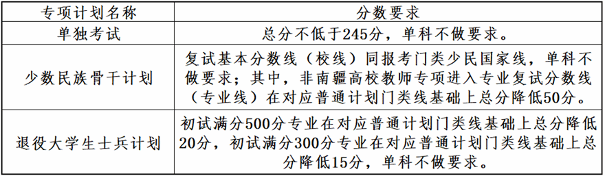 1. 各招生学院(部)可根据学科特点、招生计划数量等确定本单位各学科专业考生进入复试的初试成绩要求(专业分数线)。