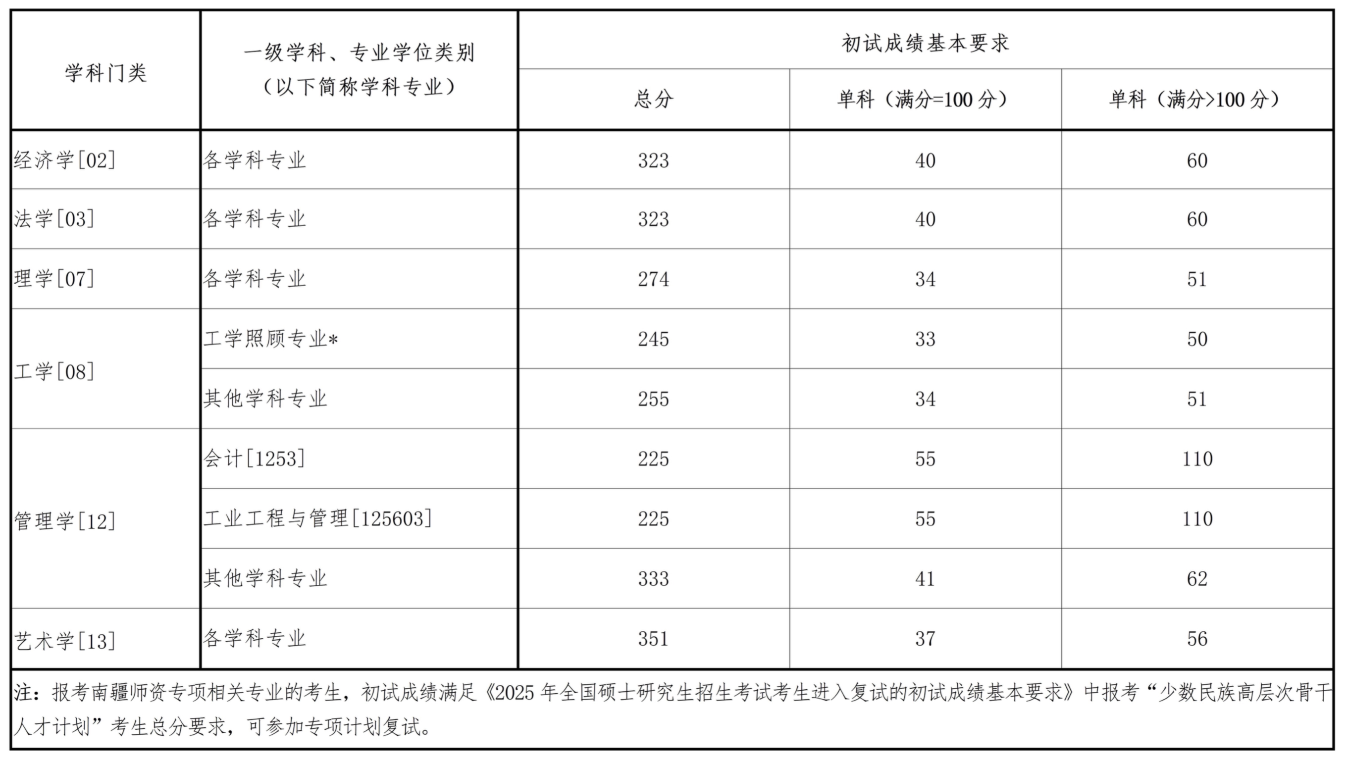 1. 进入复试的初试成绩基本要求是我校各学科专业考生(含各类专项计划考生,下同)进入复试的最低分数要求,各学院可根据学科特点、招生计划数、生源情况制定本单位各学科专业考生进入复试的初试成绩要求。考生初试成绩须达到各学院制定的各学科专业考生进入复试的初试成绩要求才能进入复试。