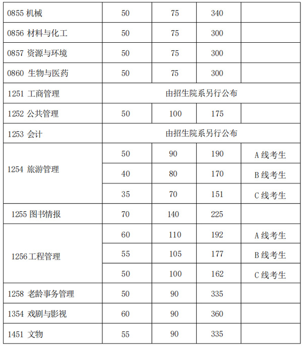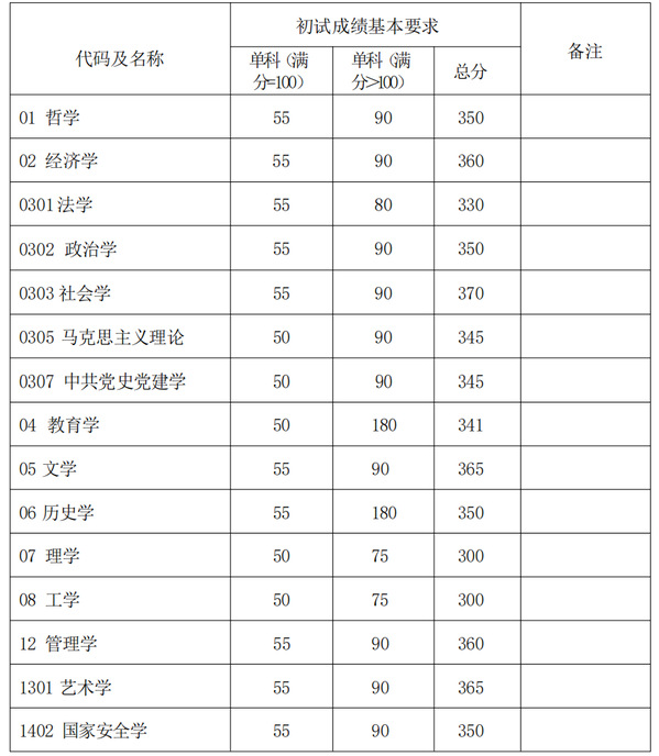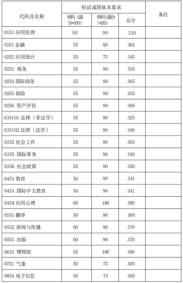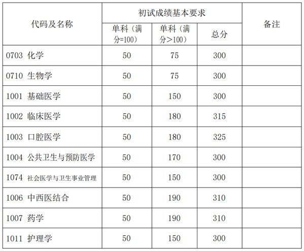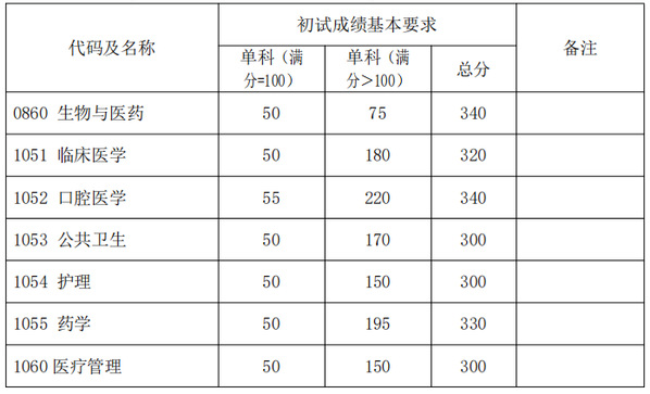 其中面向西藏地区“公共管理人才培养计划”专项,满分100分的单科成绩不低于40分、满分200分的单科成绩不低于90分、总分不低于160分;面向新疆喀什地区医学硕士专项,总分不低于235分,各单科成绩不作要求。