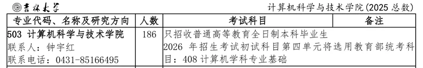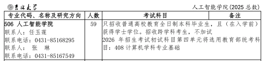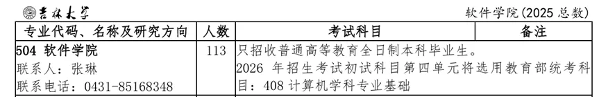 吉林大学在25招生专业目录中,26考研人工智能学院、软件学院、计算机科学与技术学院,初试科目第四单元将选用教育部统考科目:408计算机学科专业基础。