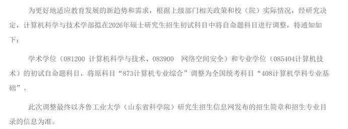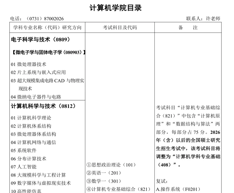 自2026研究生招生年度起,计算机技术专业(085404)、人工智能专业(085410)和农业工程与信息技术专业(095136)的业务课考试由自命题科目“842数据结构和C语言”调整为统考科目“408计算机学科专业基础”。