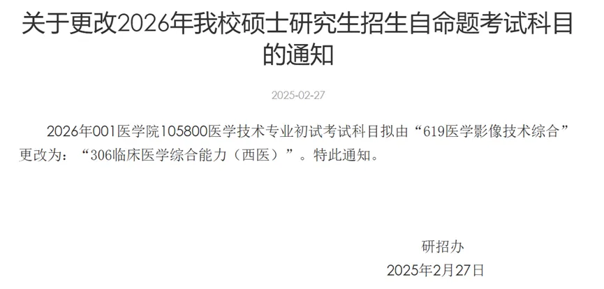 2026年001医学院105800医学技术专业初试考试科目拟由“619医学影像技术综合”更改为:“306临床医学综合能力(西医)”。