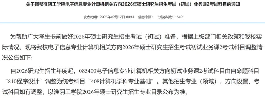 自2026研究生招生年度起,085400电子信息专业计算机相关方向初试业务课2考试科目由自命题科目“810程序设计”调整为统考科目“408计算机学科专业基础”。
