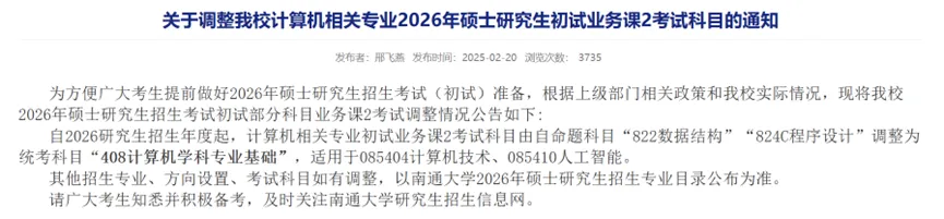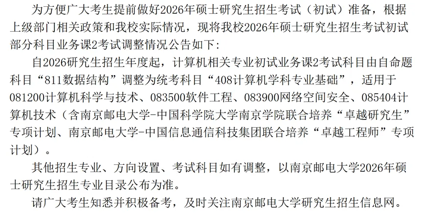 自2026研究生招生年度起,计算机相关专业初试业务课2考试科目由自命题科目“811数据结构”调整为统考科目“408计算机学科专业基础”,适用于081200计算机科学与技术、083500软件工程、083900网络空间安全、085404计算机技术(含南京邮电大学-中国科学院大学南京学院联合培养“卓越研究生”专项计划、南京邮电大学-中国信息通信科技集团联合培养“卓越工程师”专项计划)。