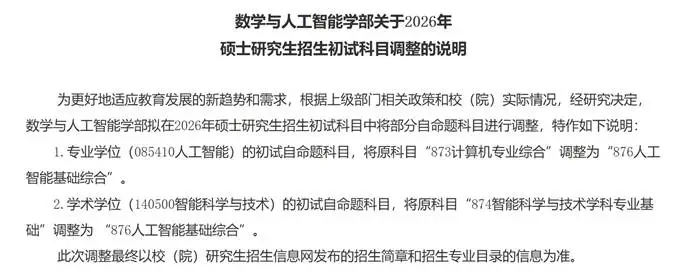 专业学位(085410人工智能)的初试自命题科目,将原科目“873计算机专业综合”调整为“876人工智能基础综合”。学术学位(140500智能科学与技术)的初试自命题科目,将原科目“874智能科学与技术学科专业基础”调整为“876人工智能基础综合”。