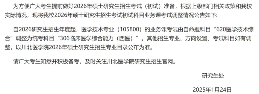 自2026研究生招生年度起,医学技术专业(105800)的业务课考试由自命题科目“620医学技术综合”调整为统考科目“306临床医学综合能力(西医)”。