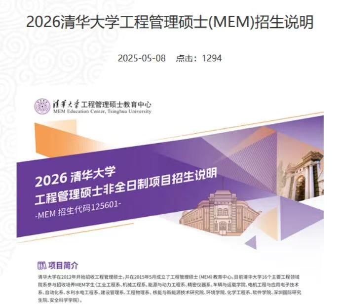 清华大学工程管理硕士教育中心发布了2026清华大学工程管理硕士(MEM)招生说明。清华大学发布了2026工程管理硕士招生说明。