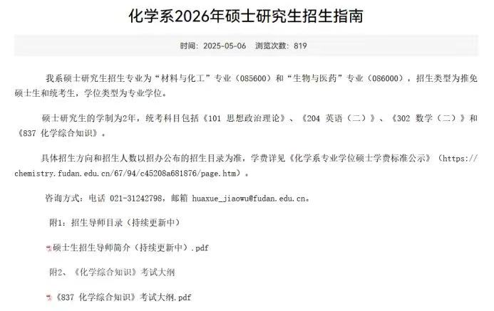 复旦大学化学系发布了2026年硕士研究生招生指南。
