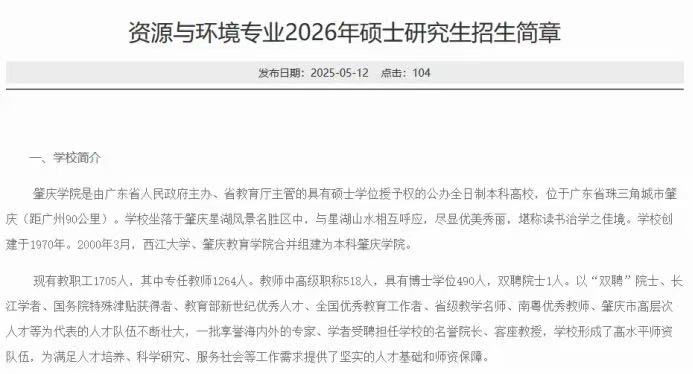 肇庆学院环境与工程学院发布了资源与环境专业2026年硕士研究生招生简章。