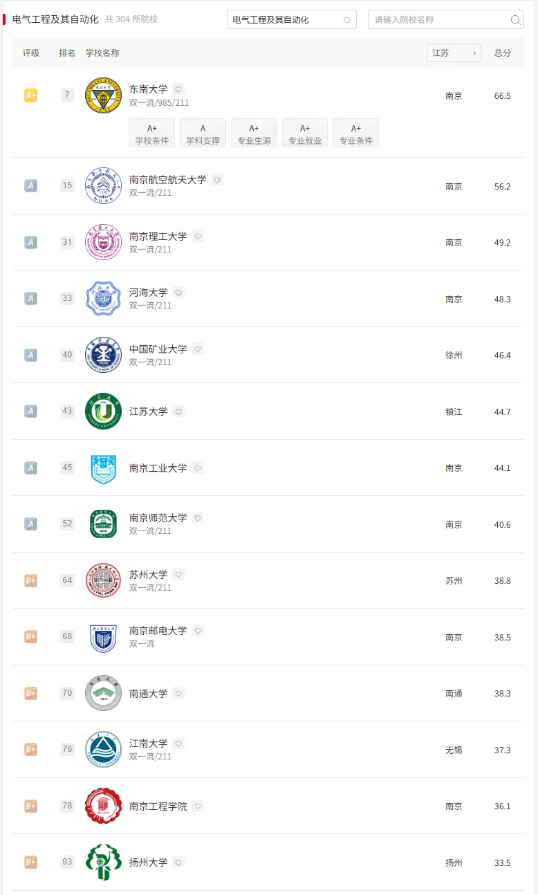 2025年软科中国大学专业排名正式发布,江苏省高校在电气工程及其自动化领域的表现依旧亮眼。作为我国高等教育强省,江苏拥有多所在电气工程学科上实力突出的院校,涵盖顶尖985高校、特色211院校以及高水平应用型大学。本次排名中,东南大学、南京航空航天大学、中国矿业大学等高校继续保持领先地位,而江苏大学、南京理工大学等院校也在该专业上展现出强劲的竞争力。本文基于软科最新数据,系统梳理江苏地区电气工程及其自动化专业的高校排名、学科等级及录取情况,为2026年考研生提供参考。