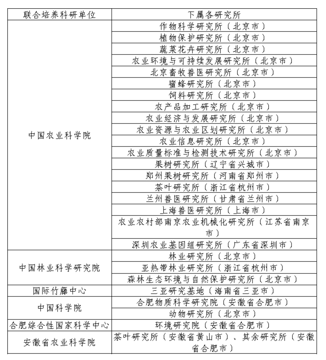 (一)为支持安徽省江淮粮仓研究院(“1+5”农业科技创新联盟)建设,我校大力开展与国内高水平科研单位联合培养硕士研究生工作,联合培养科研单位详见下表: