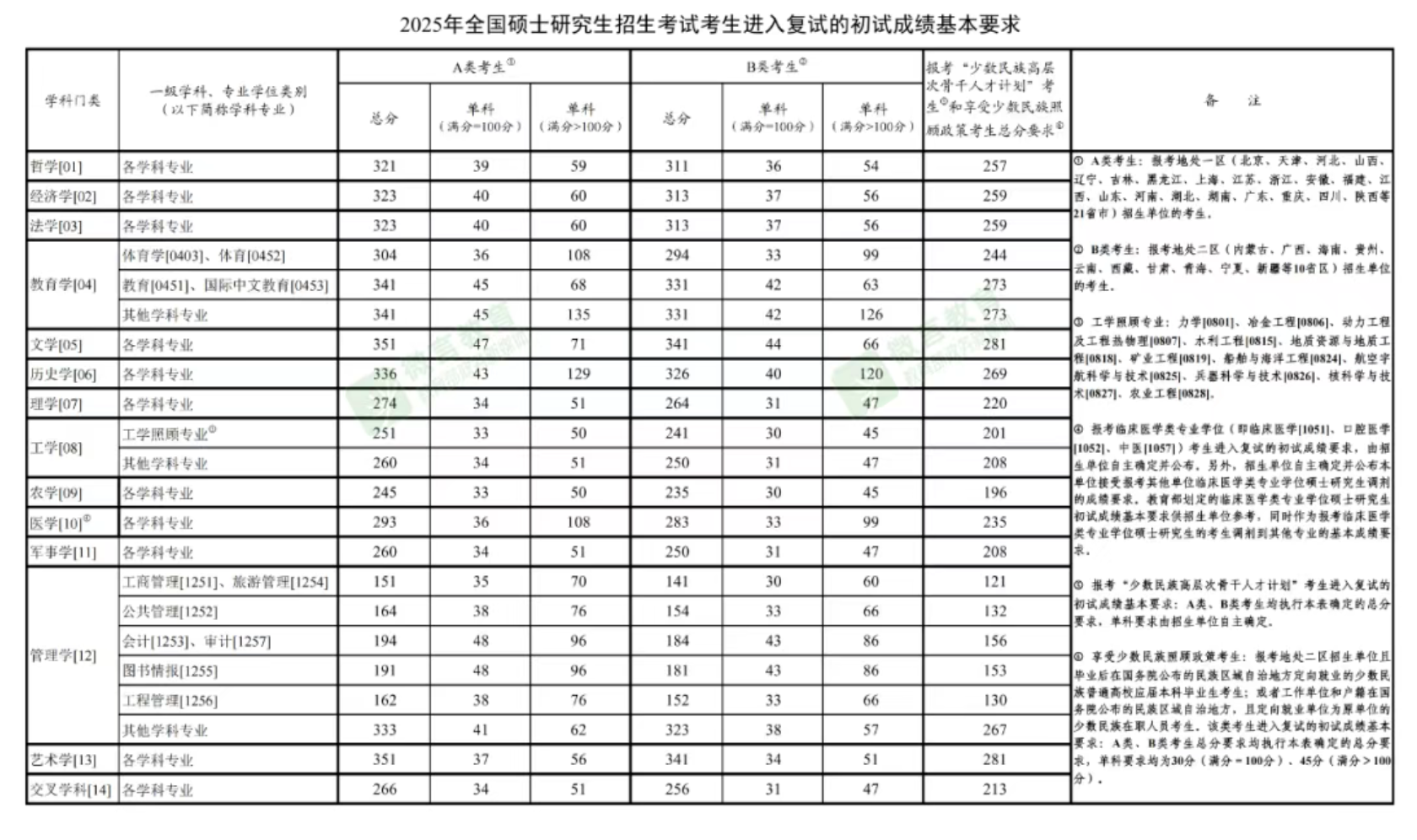 2025年全国硕士研究生招生考试考生进入复试 初试成绩基本要求