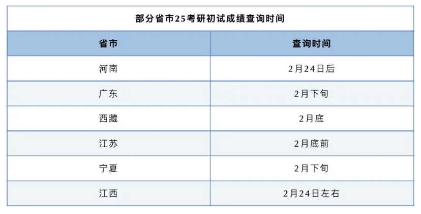 目前,已有6个省市透露2025考研初试成绩查询时间,时间多为2月下旬、2月24日左右。